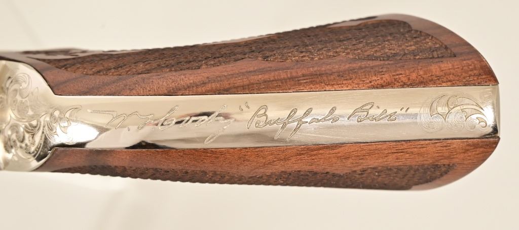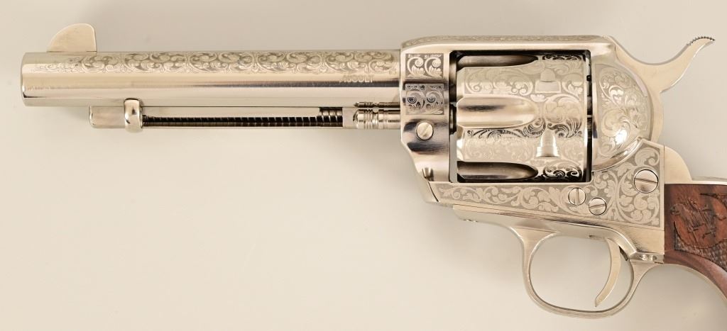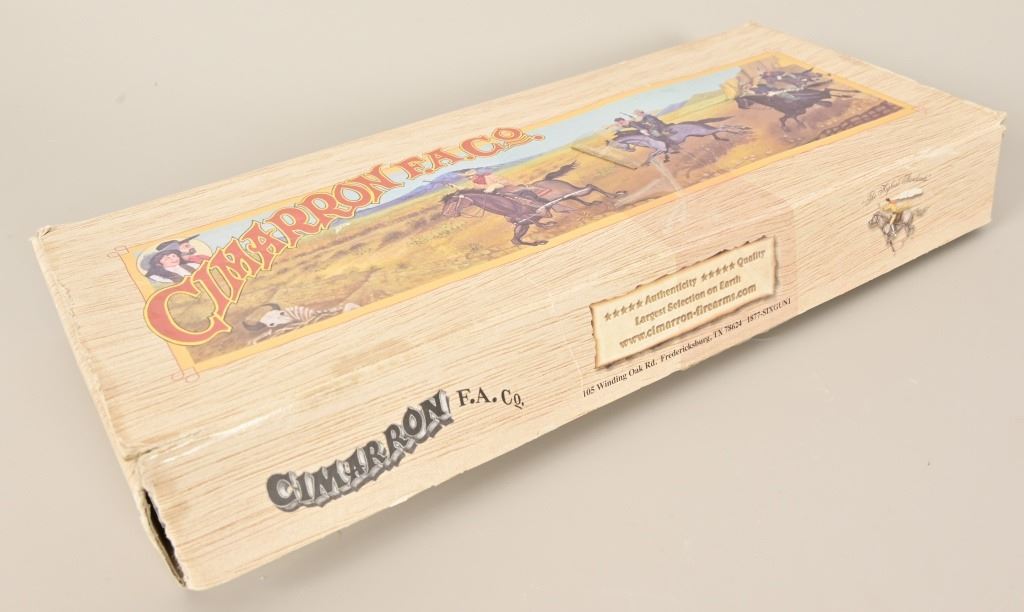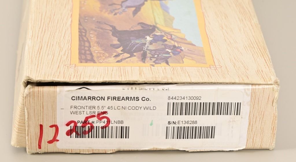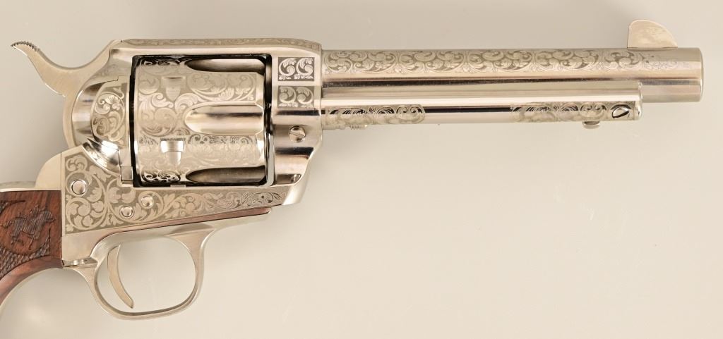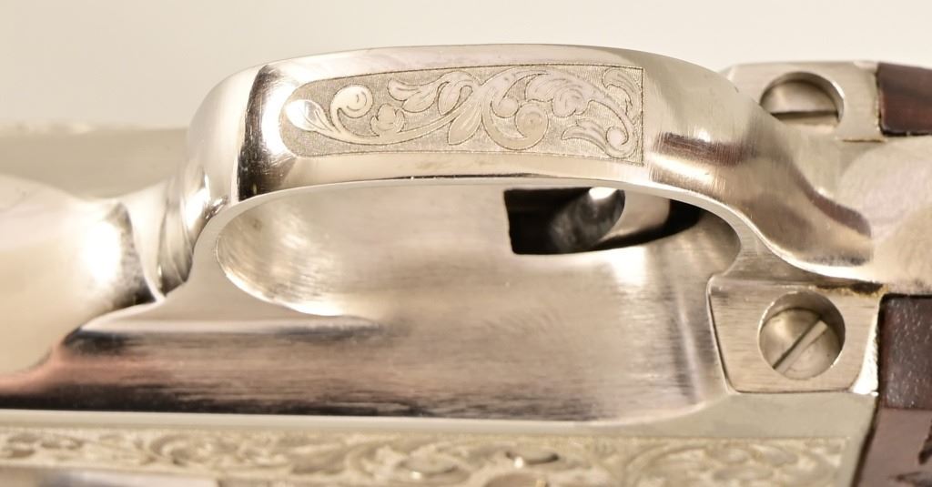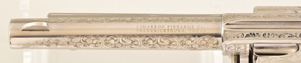 S/N E136288. Like new in box. 5.5" barrel. Nickel with factory laser engraving. Fancy checkered grips. Made by Pietta. Modern.