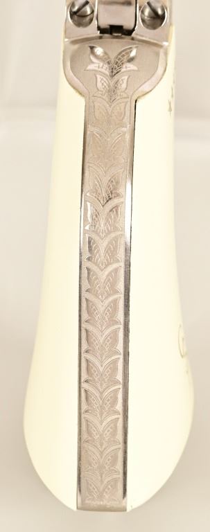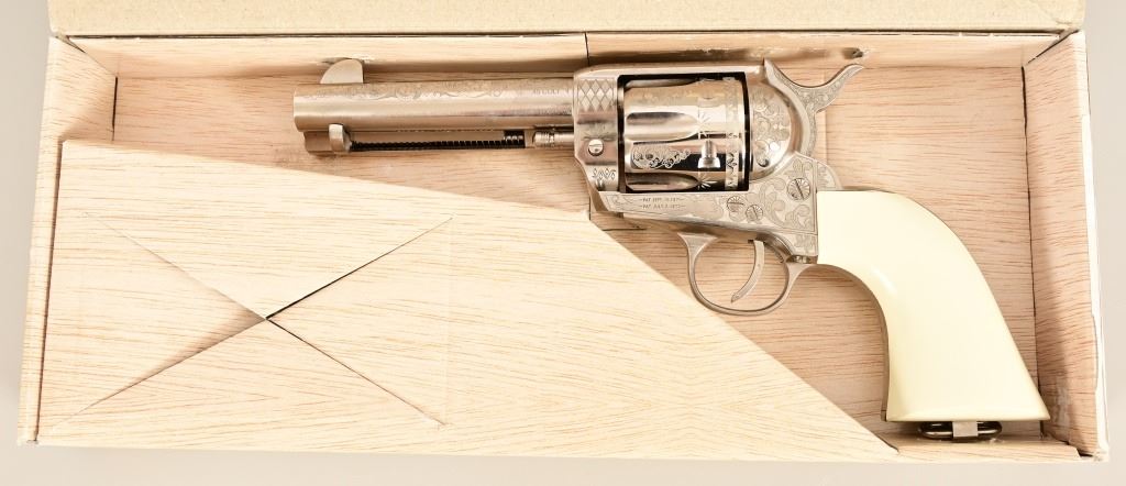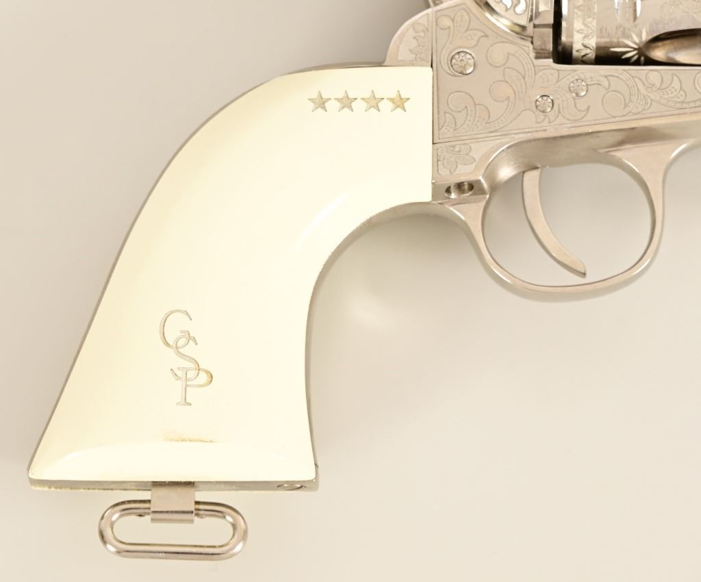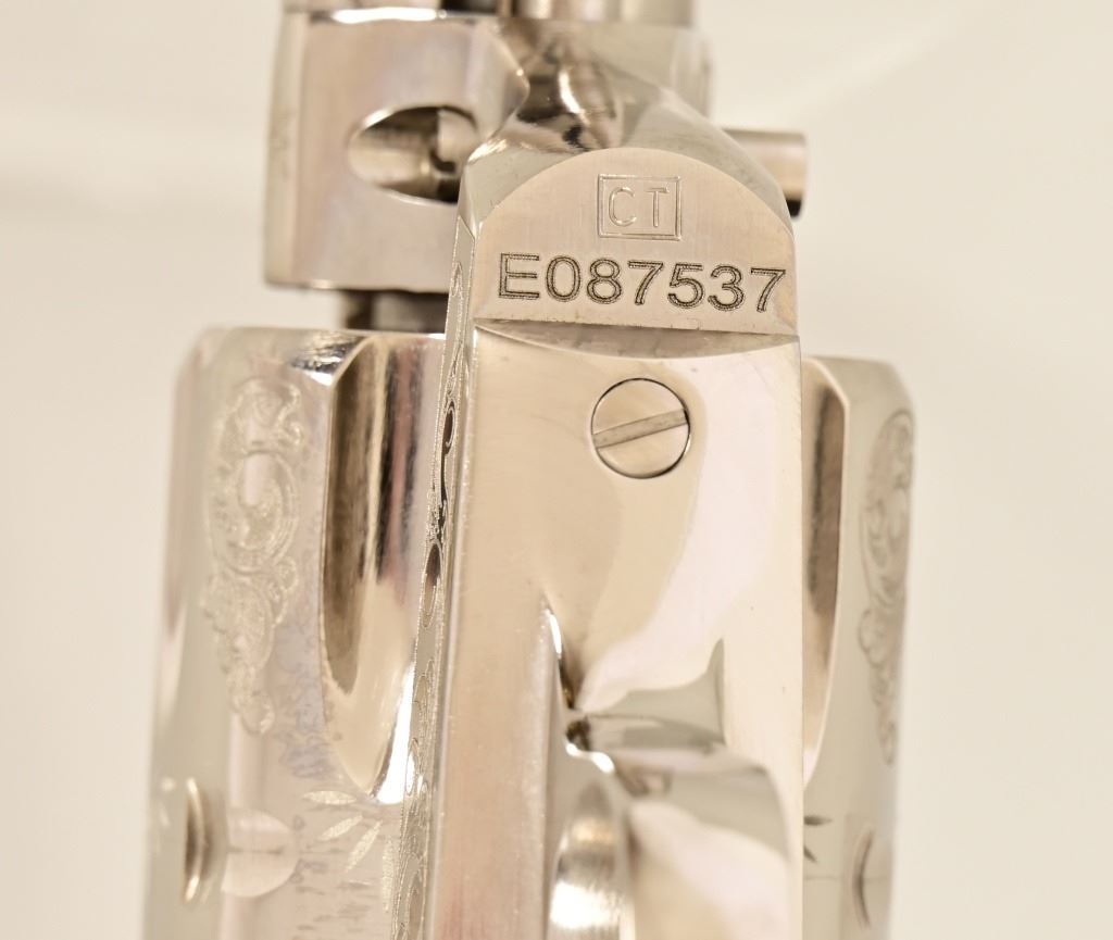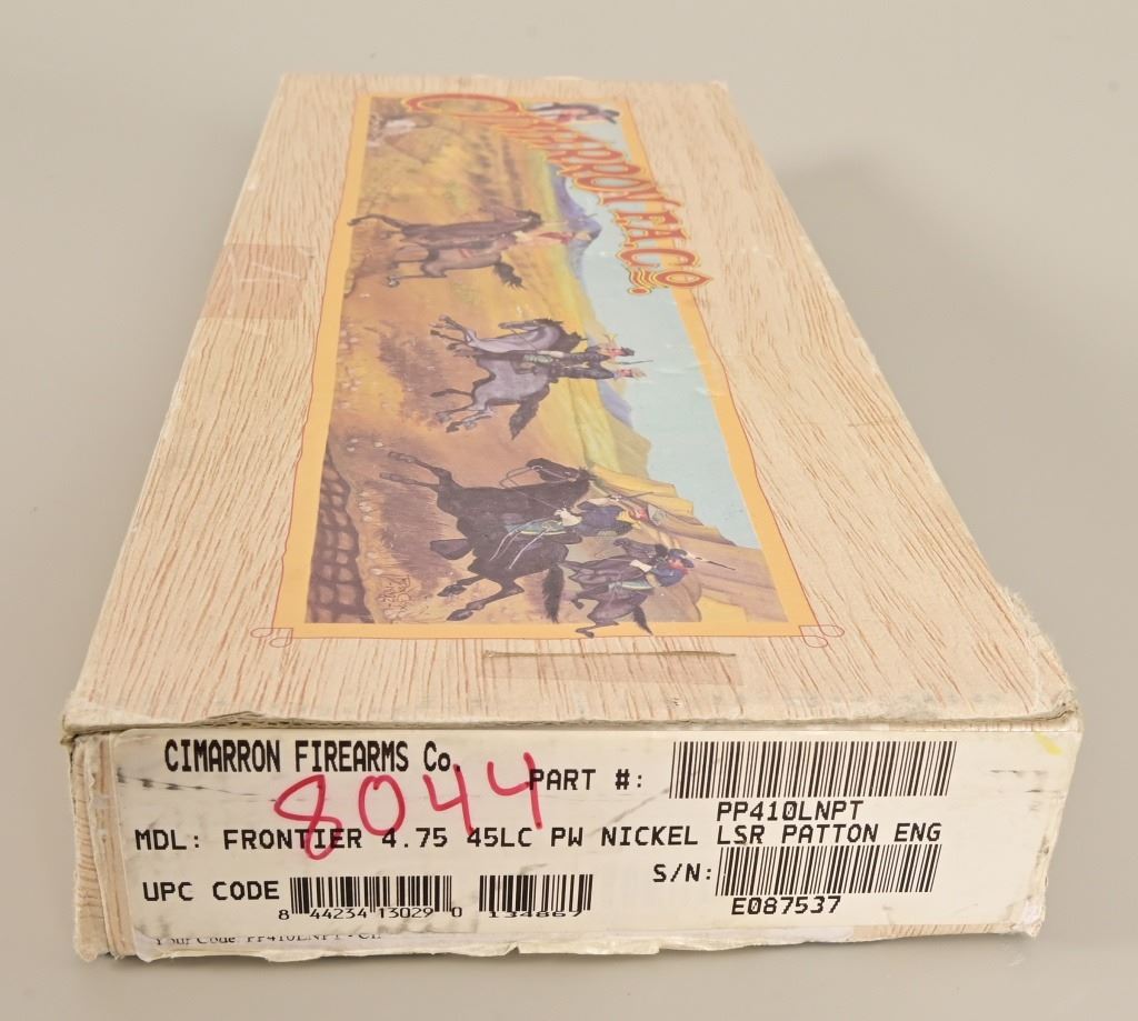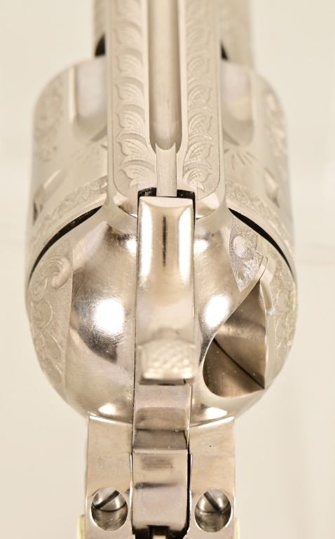 S/N E087537. Like new in factory box. Nickel, laser engraved. 5.5" barrel. Patton model with lanyard loop. Faux ivory grips. Modern.