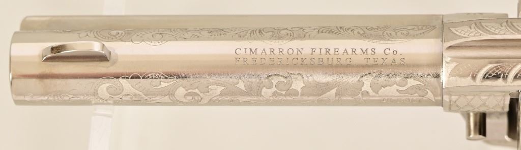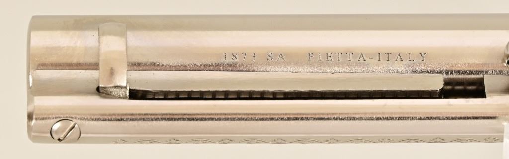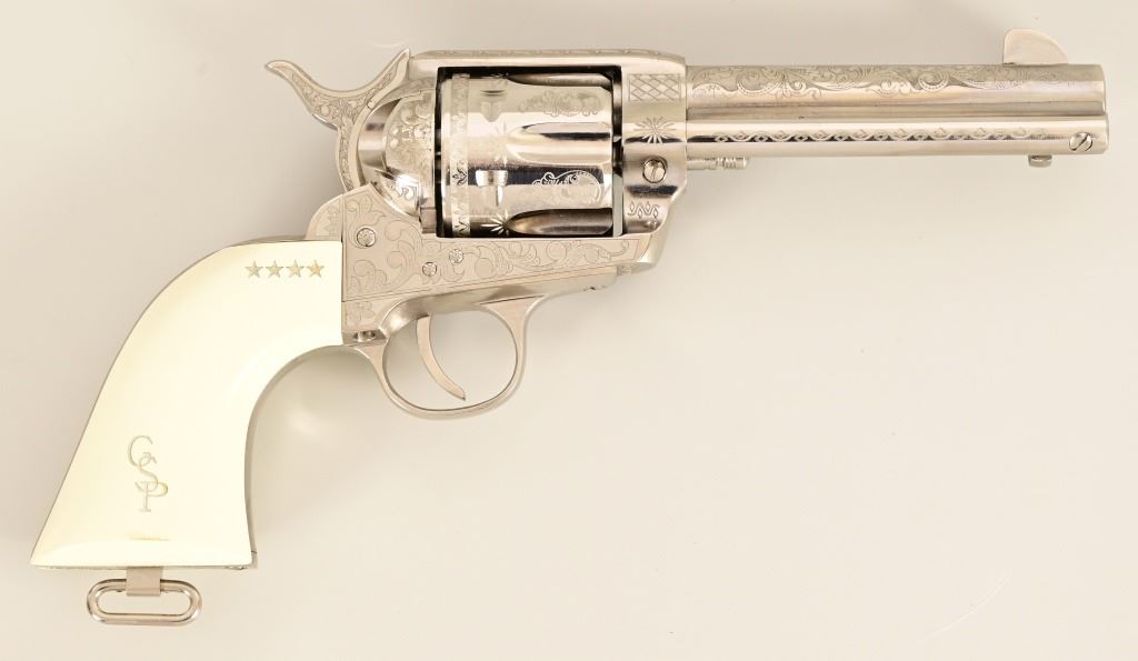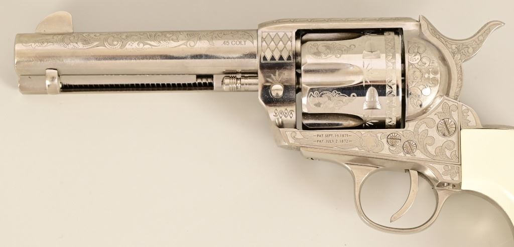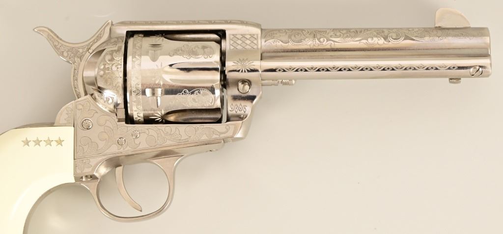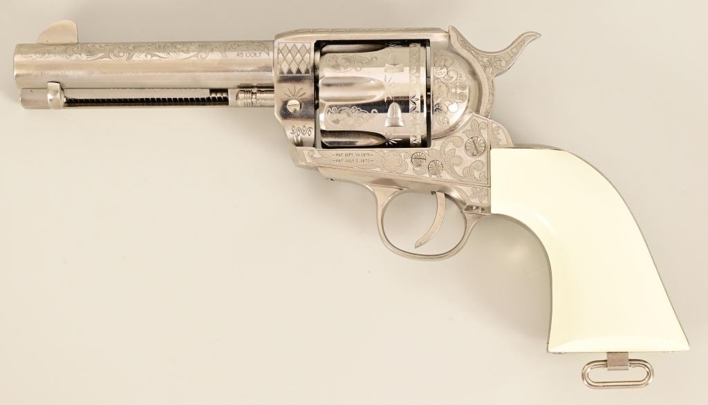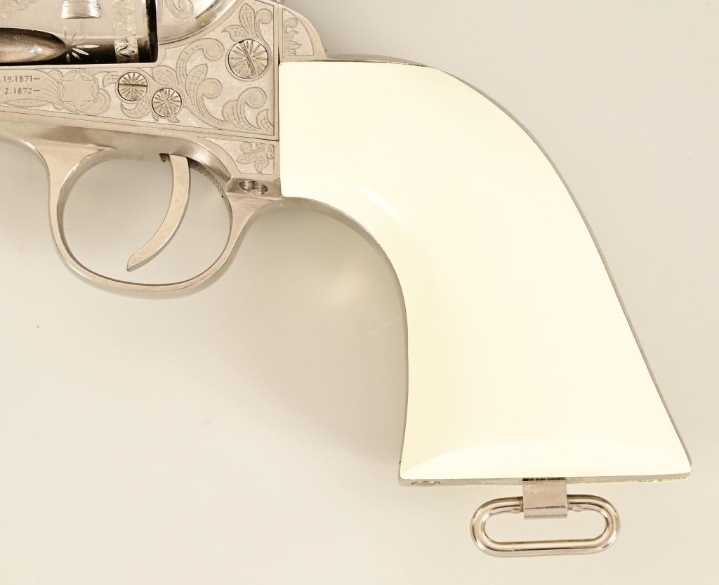 S/N E087537. Like new in factory box. Nickel, laser engraved. 5.5" barrel. Patton model with lanyard loop. Faux ivory grips. Modern.