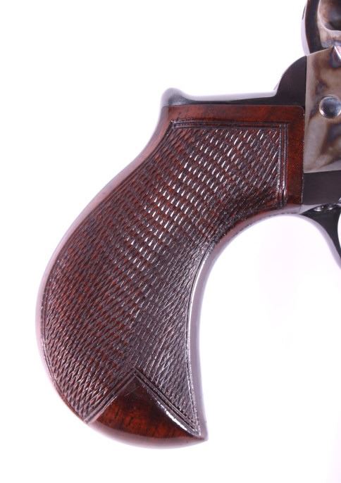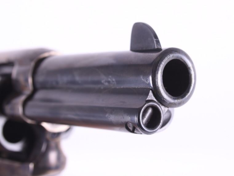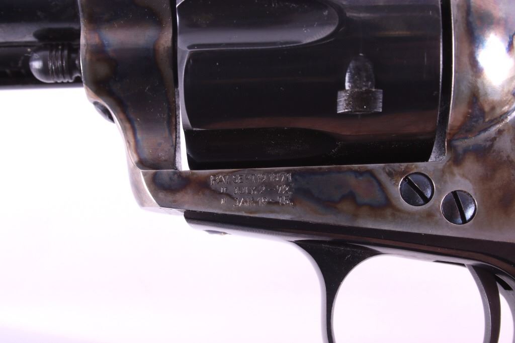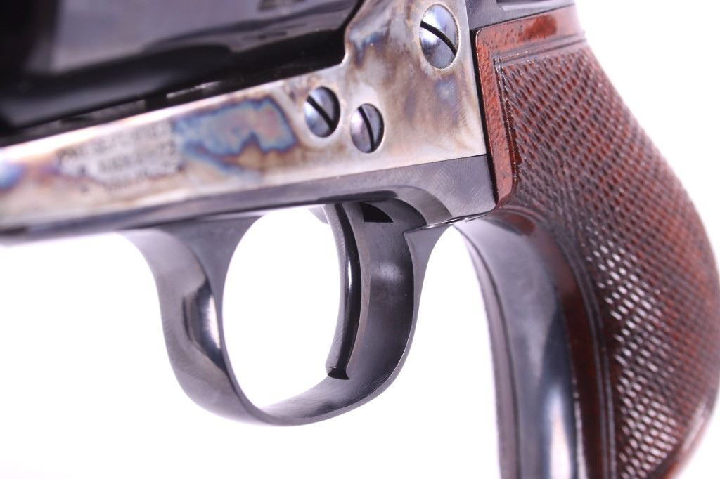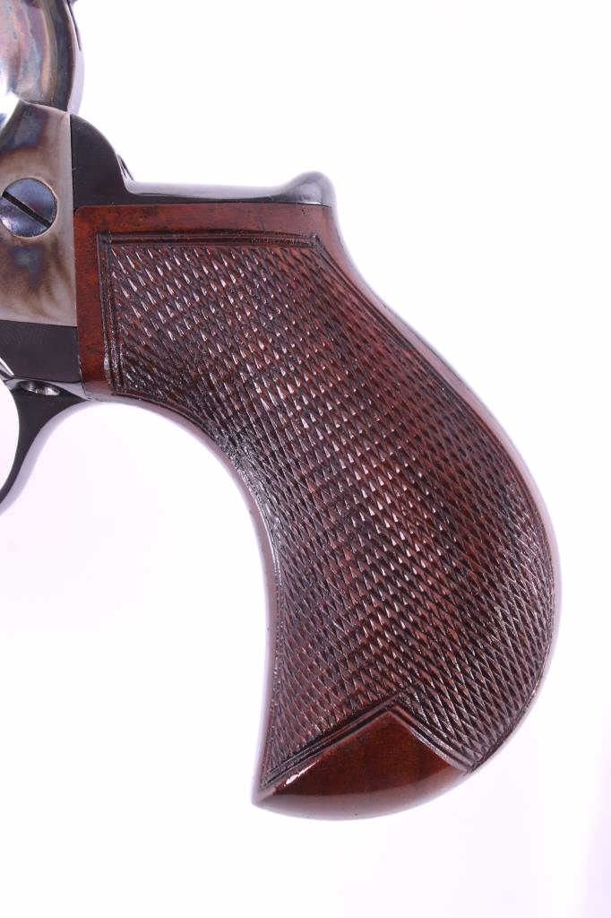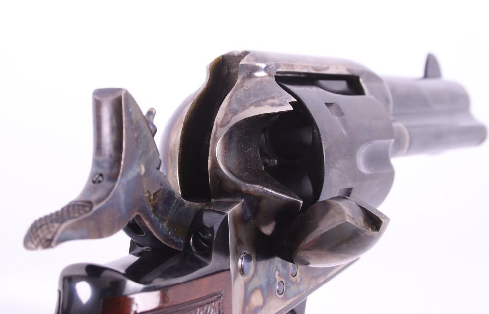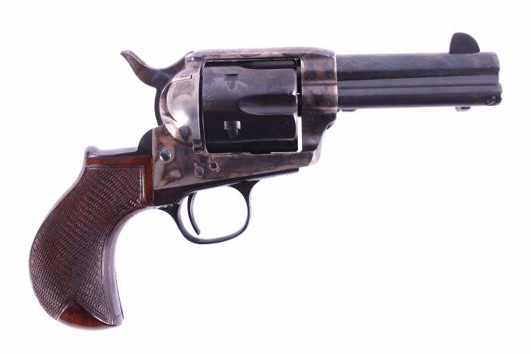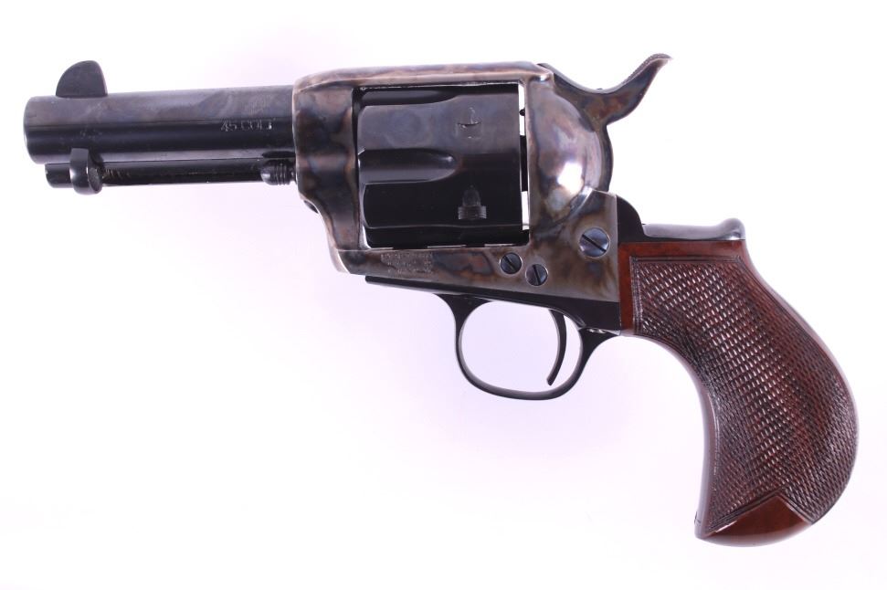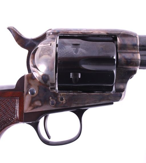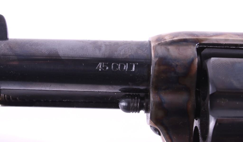 For your consideration is a Cimarron .45 Colt Thunderer Revolver. This revolver features a 3.5" blue'd barrel and six shot cylinder. The frame has been case hardened and maintains a flawless appearance. The barrel is marked "Cimarron - Fredricksburg Texas. - Manufactured by Uberti - Italy." On the top and "45 Colt" on the left side. The single shot revolver showcase gorgeous American walnut grips. Serial Number: C110330. This is a modern gun and requires a FFL transfer or NICS background check.