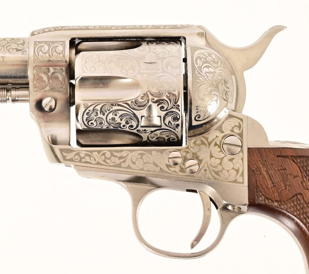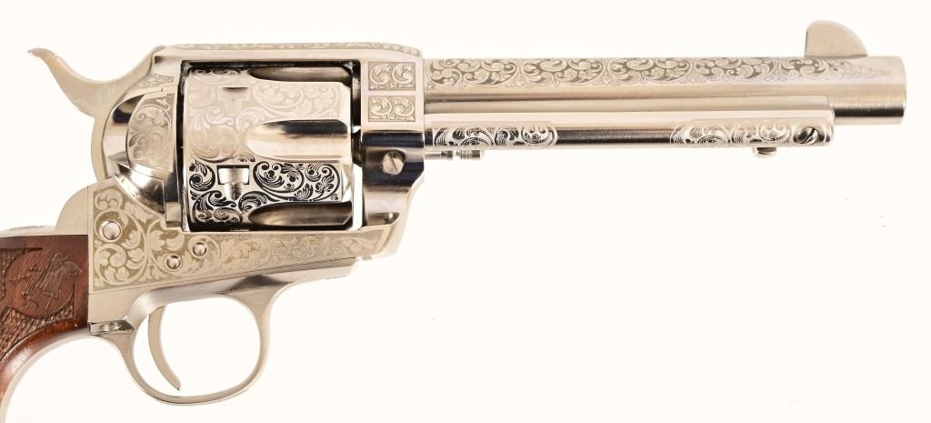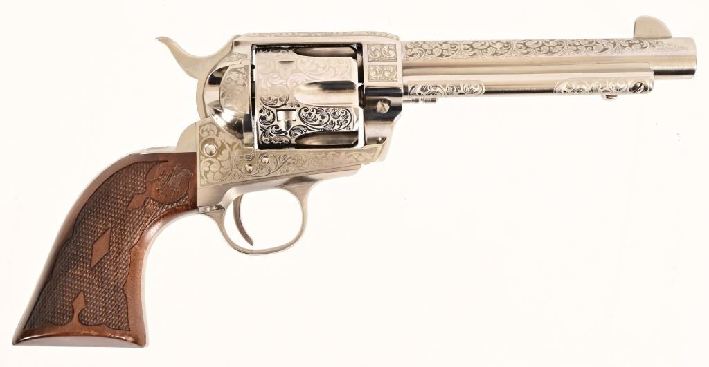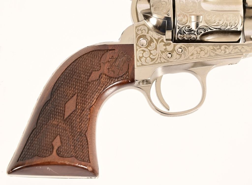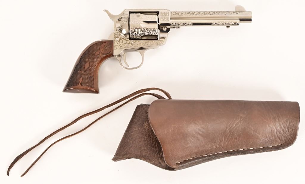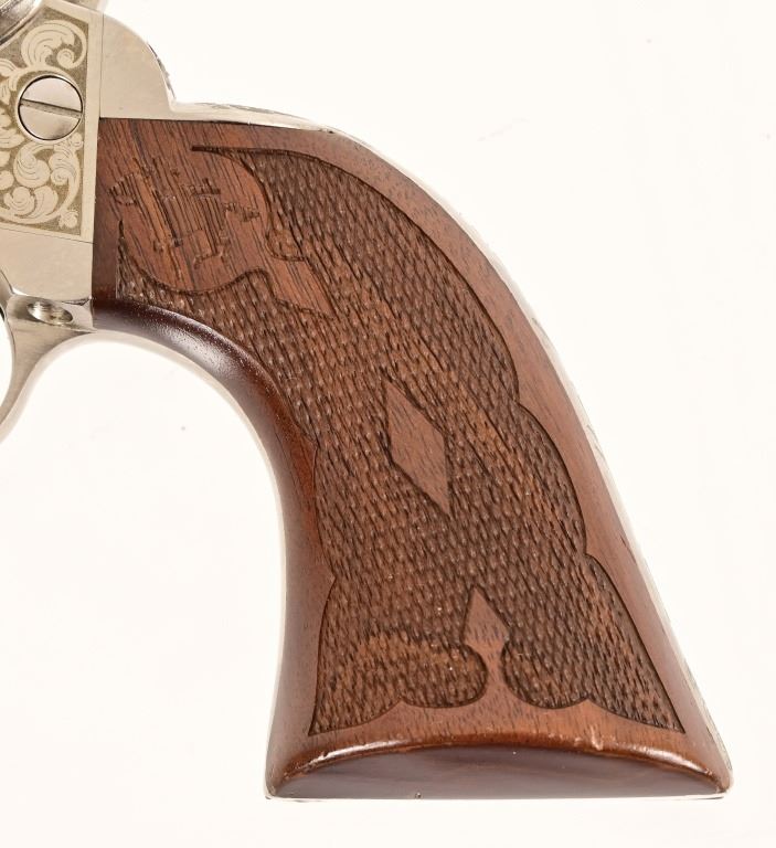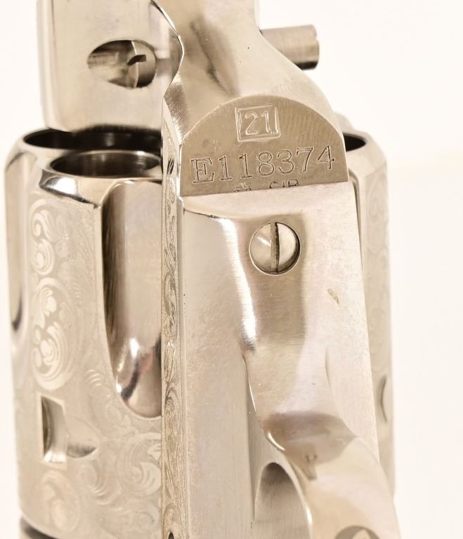 S/N E118374. Made by Pietta. 5 3/8" barrel, very nice condition. Nickel, factory laser engraved. Fancy checkered grips. Comes with holster. Modern.