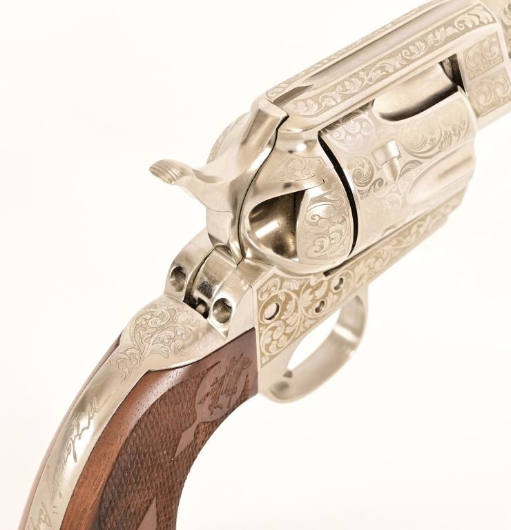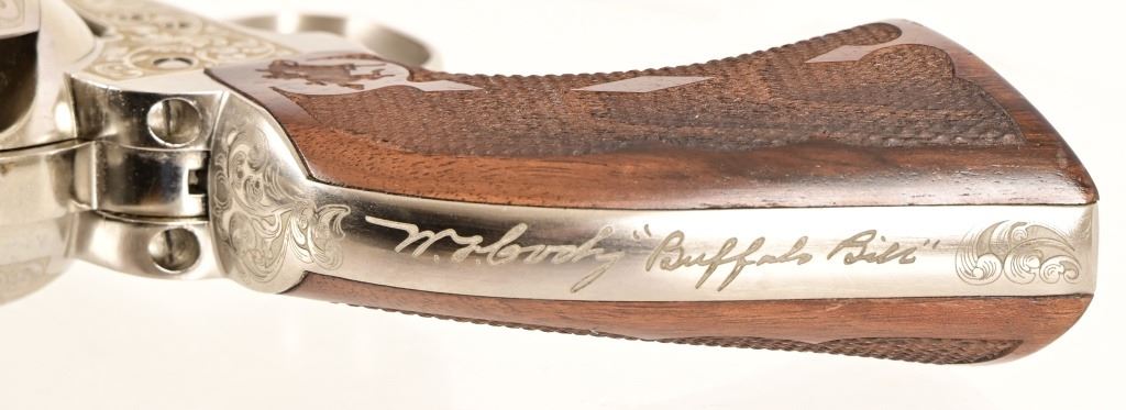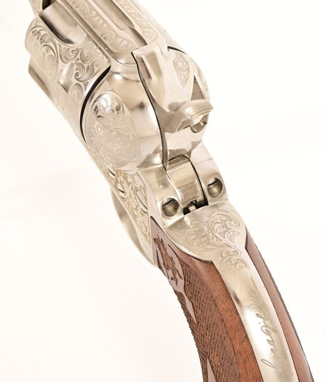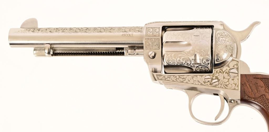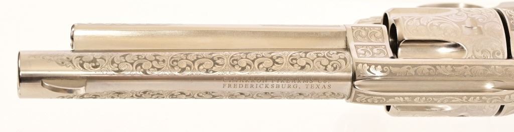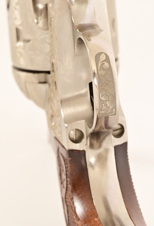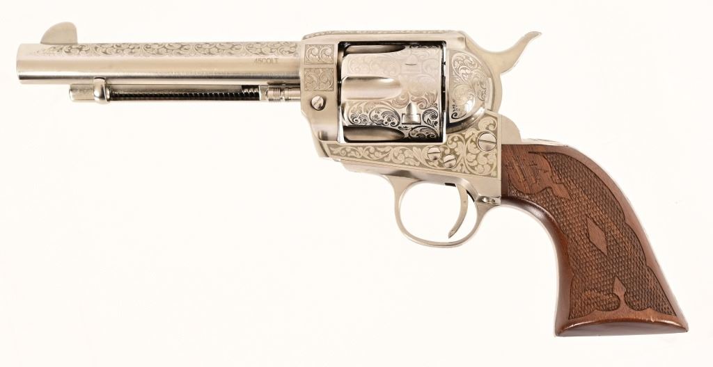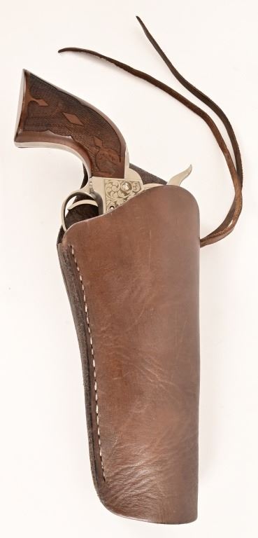 S/N E118374. Made by Pietta. 5 3/8" barrel, very nice condition. Nickel, factory laser engraved. Fancy checkered grips. Comes with holster. Modern.