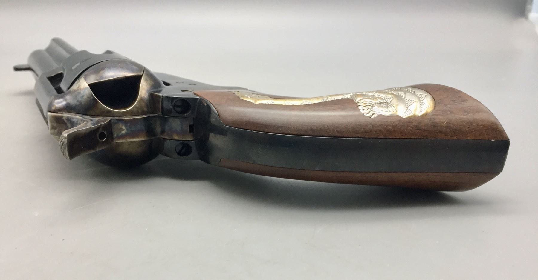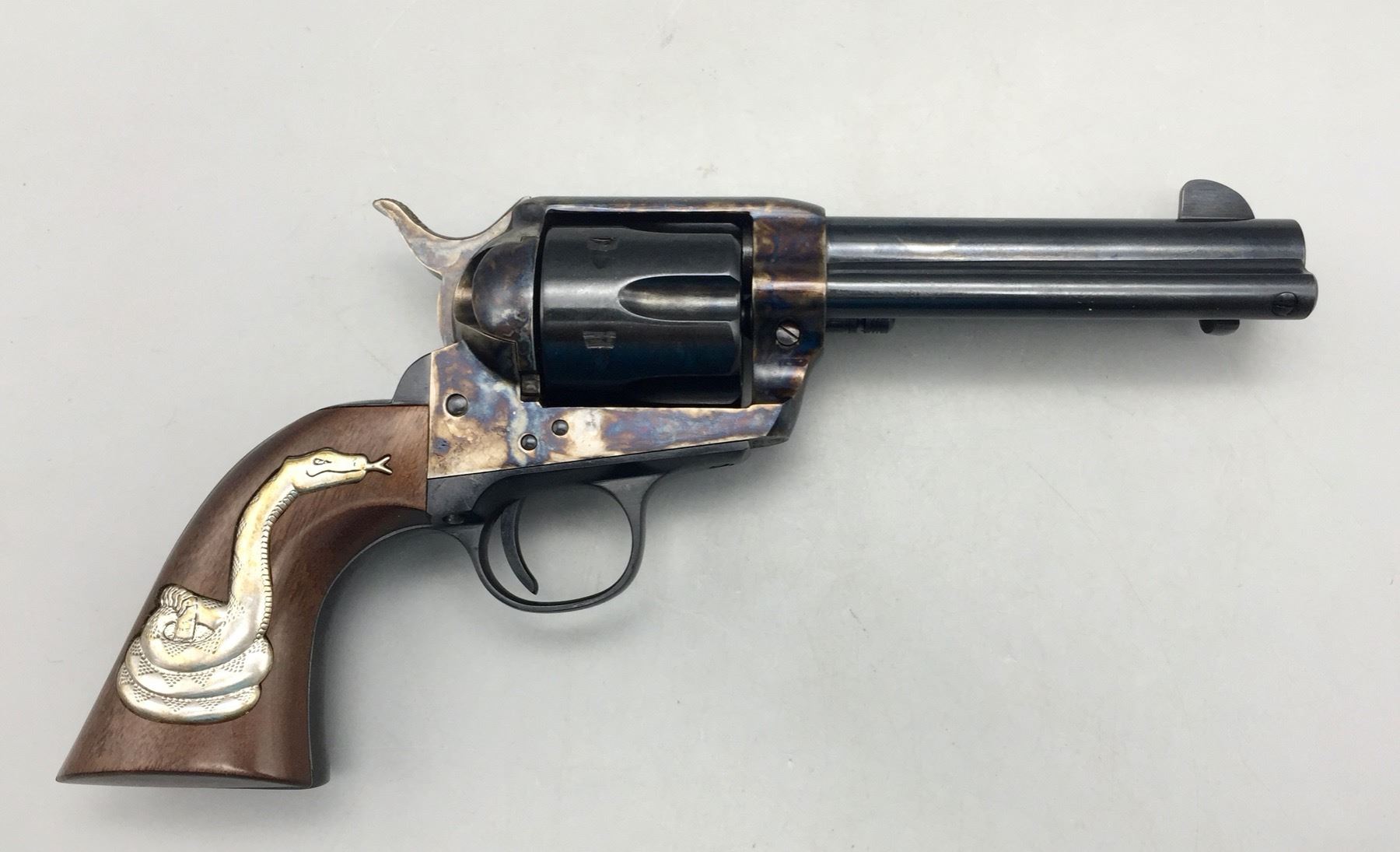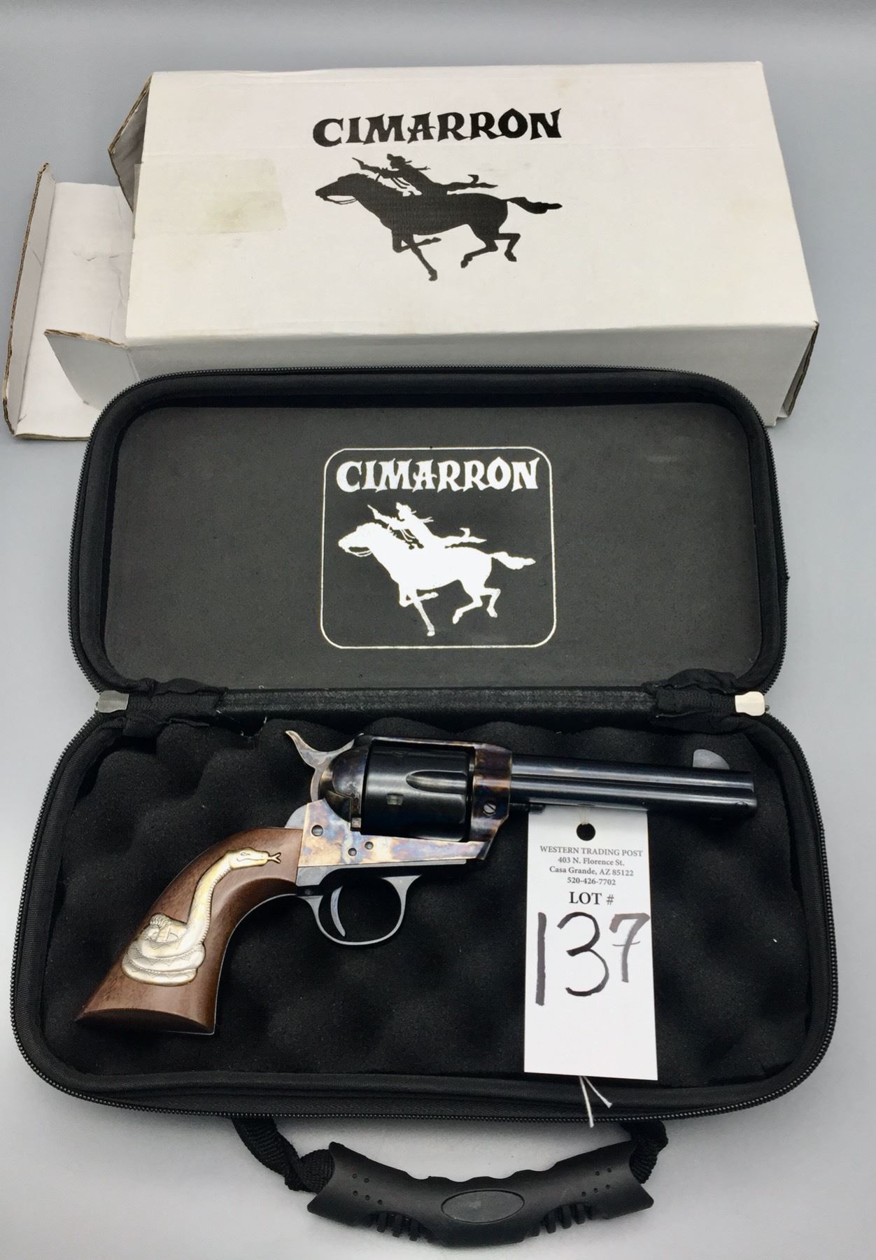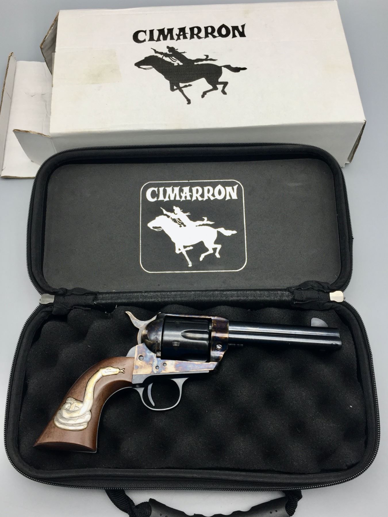 Description: For sale in this lot is a Cimarron Firearms “Man With No Name†.45 LC caliber revolver in its original packaging. Has the inlay snake on the right grip. Appears to be in unfired condition. Maker: Cimmaron Firearms, Co. Approx. Age: Vintage. Serial No. E40712. Size: Barrel measures 4-3/4†with an overall length of 11-3/8â€. Condition: Good for its age, normal wear expected. Please look closely at the pictures - they are an important part of our description. Shipping: There will be a $15 handling / packaging fee for shipping this lot. The actual cost of postage will be added on top of that. *****This firearm REQUIRES an FFL Transfer*****