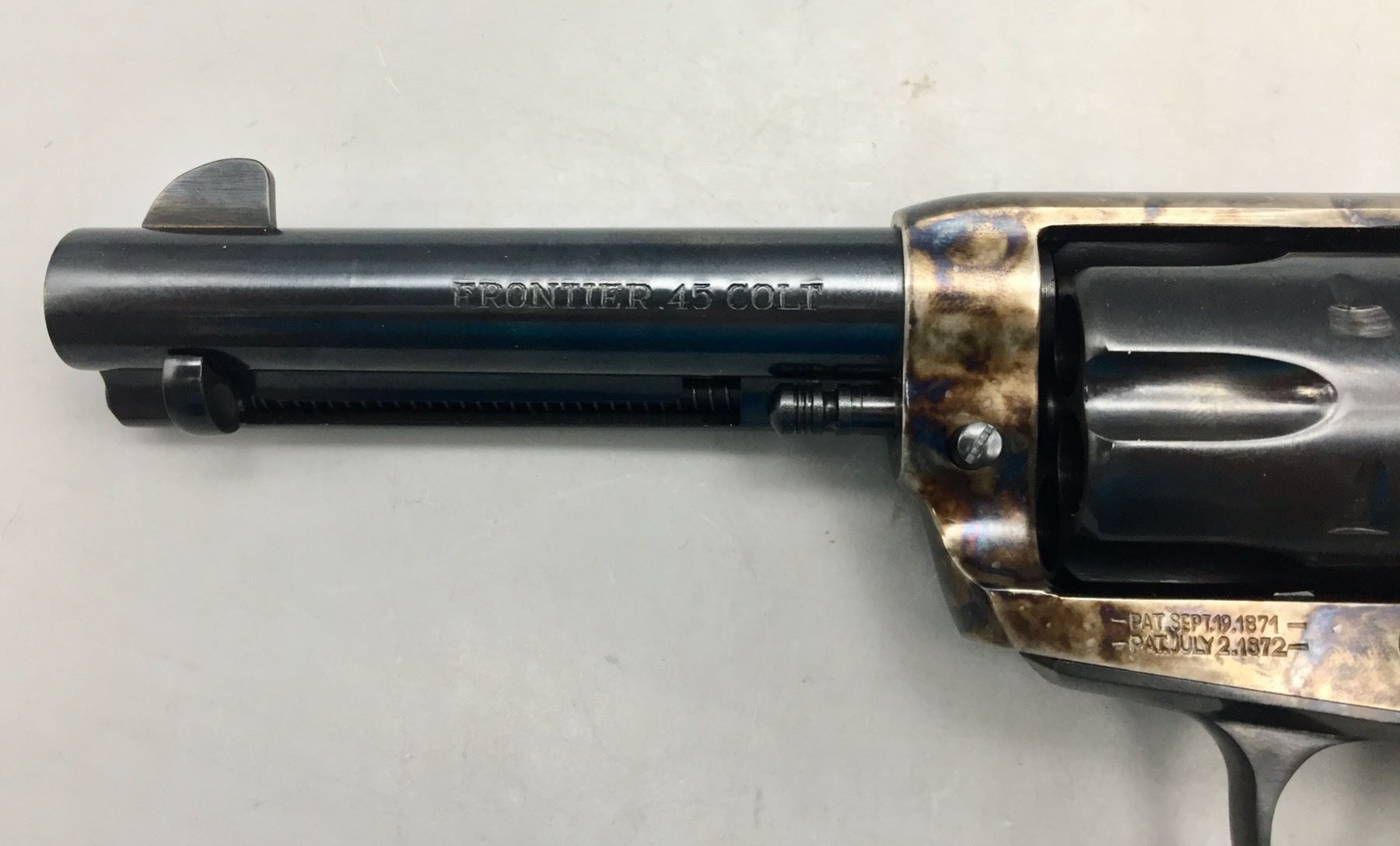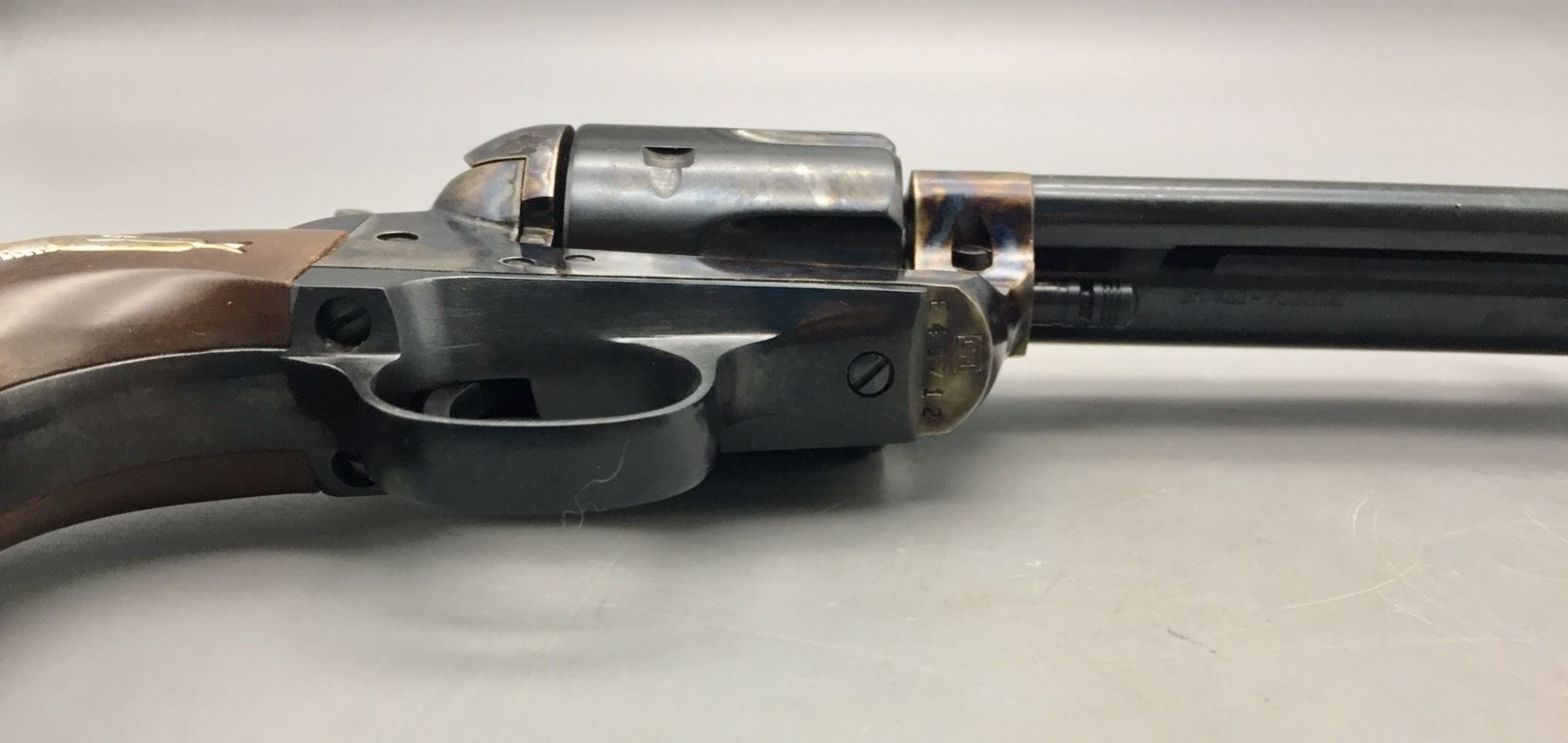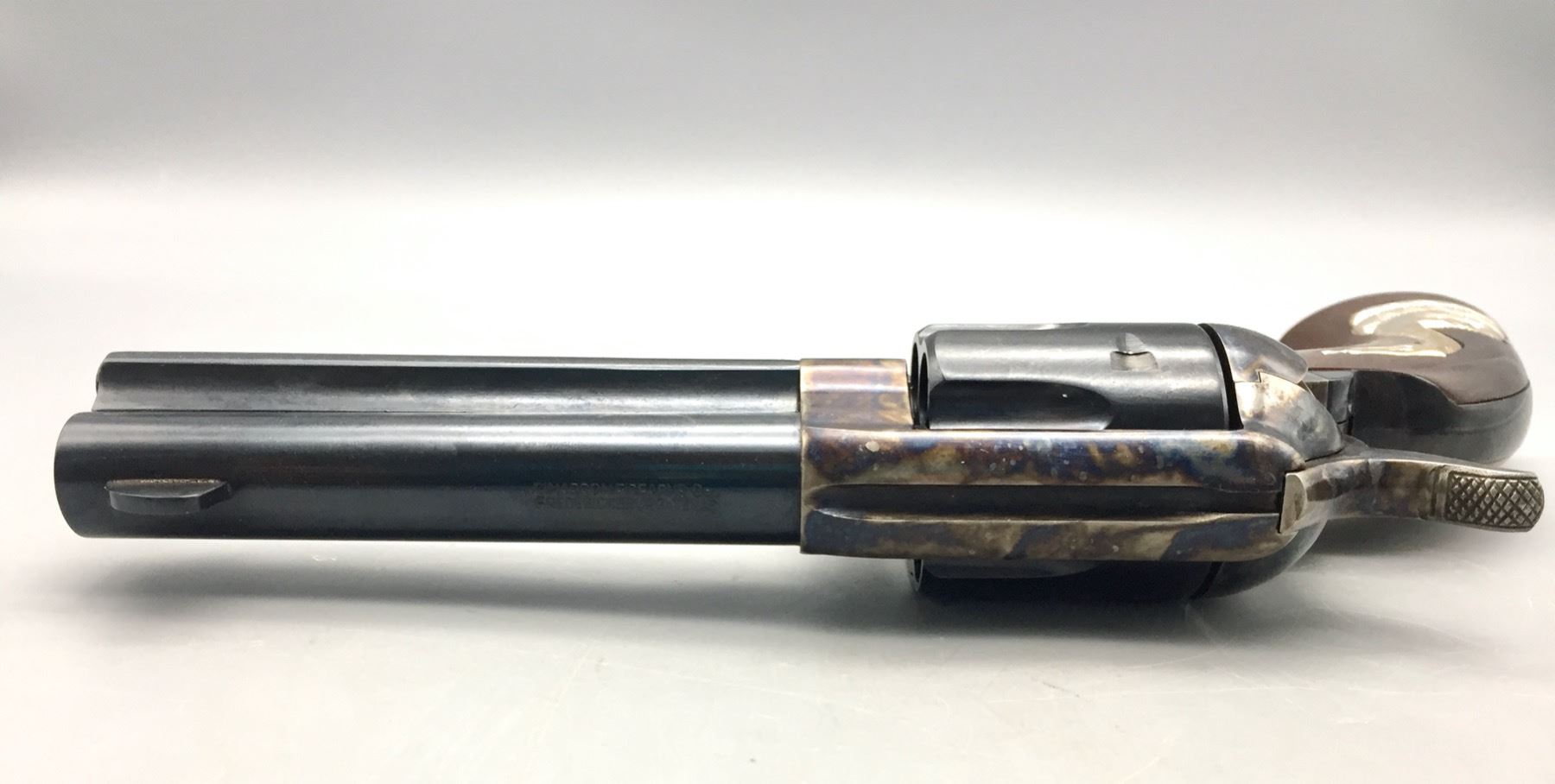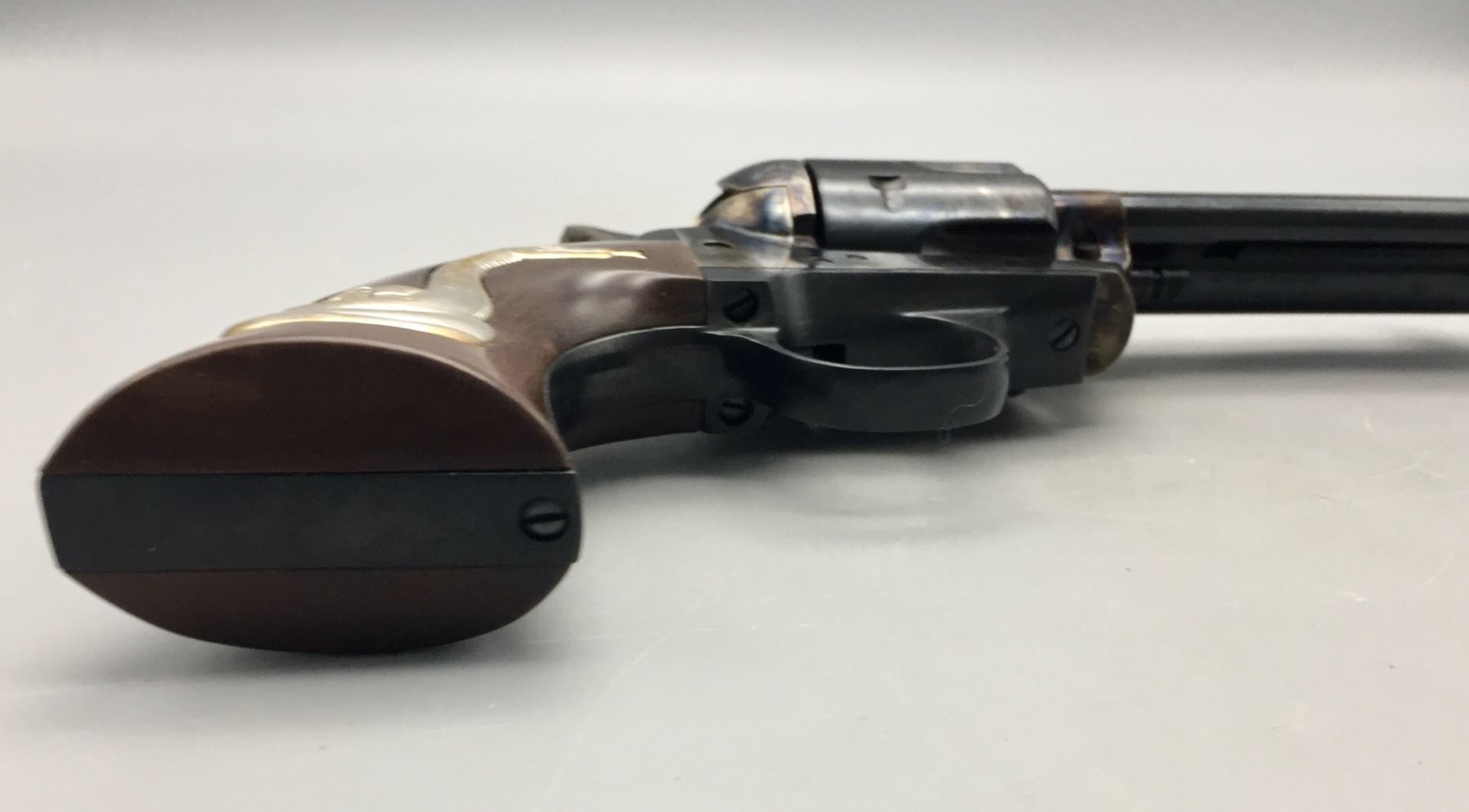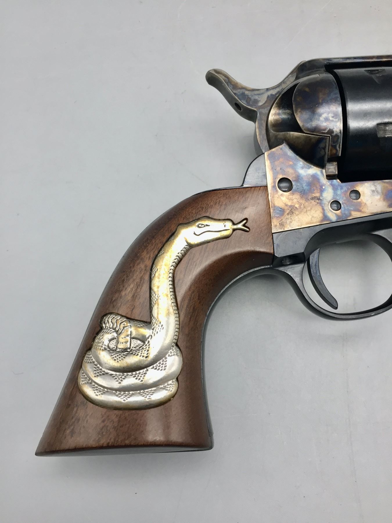 Description: For sale in this lot is a Cimarron Firearms “Man With No Name†.45 LC caliber revolver in its original packaging. Has the inlay snake on the right grip. Appears to be in unfired condition. Maker: Cimmaron Firearms, Co. Approx. Age: Vintage. Serial No. E40712. Size: Barrel measures 4-3/4†with an overall length of 11-3/8â€. Condition: Good for its age, normal wear expected. Please look closely at the pictures - they are an important part of our description. Shipping: There will be a $15 handling / packaging fee for shipping this lot. The actual cost of postage will be added on top of that. *****This firearm REQUIRES an FFL Transfer*****