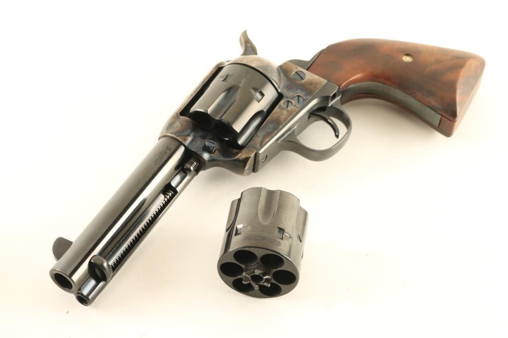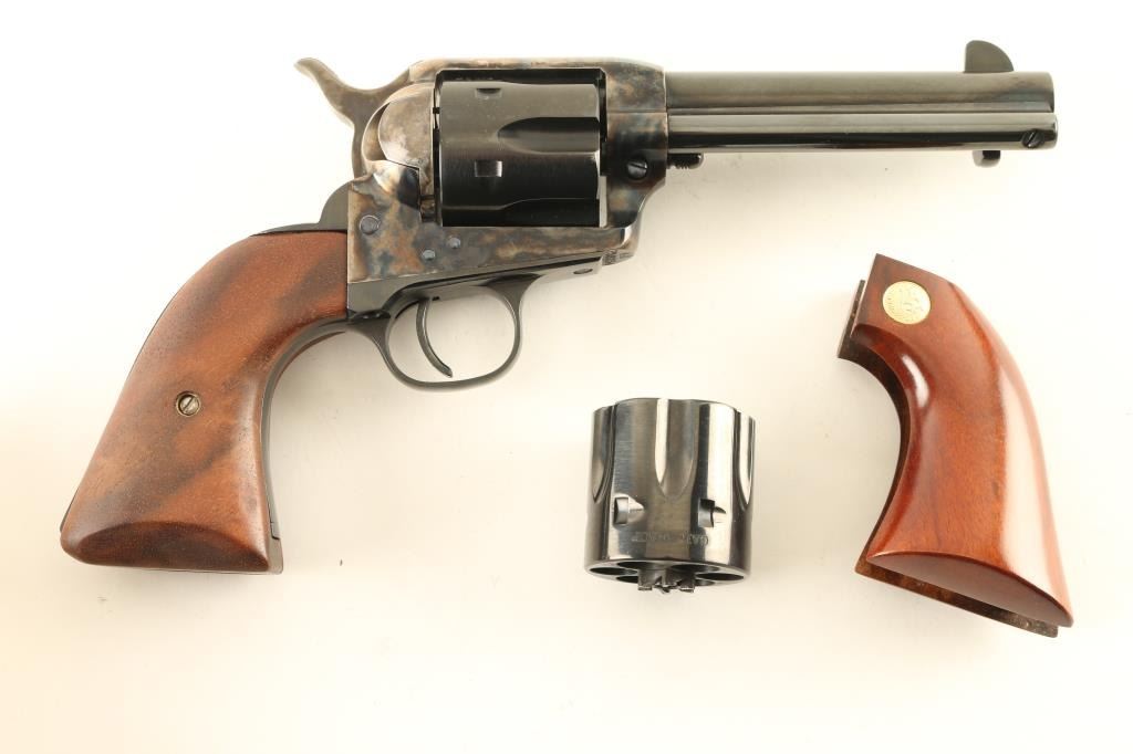 Italian made single action six-shot revolver imported by Cimarron of Fredericksburg, Texas. Features blued finish (with case colored frame, loading gate, hammer), 4 3/4" barrel, blade front sight, square notched rear sight, smooth thin trigger, knurled hammer spur, fluted cylinder, ejector rod, three piece smooth walnut grip with bottom filler piece to give a longer grip length. Overall condition is like new with few signs of handling. Includes a Cimarron cardboard box with documents and matching label, original factory one piece smooth wood grip with Cimarron medallions, both a 45 Colt cylinder (installed) and a 45 ACP cylinder. Condition is NRA Excellent - like new *** Modern Firearm ***