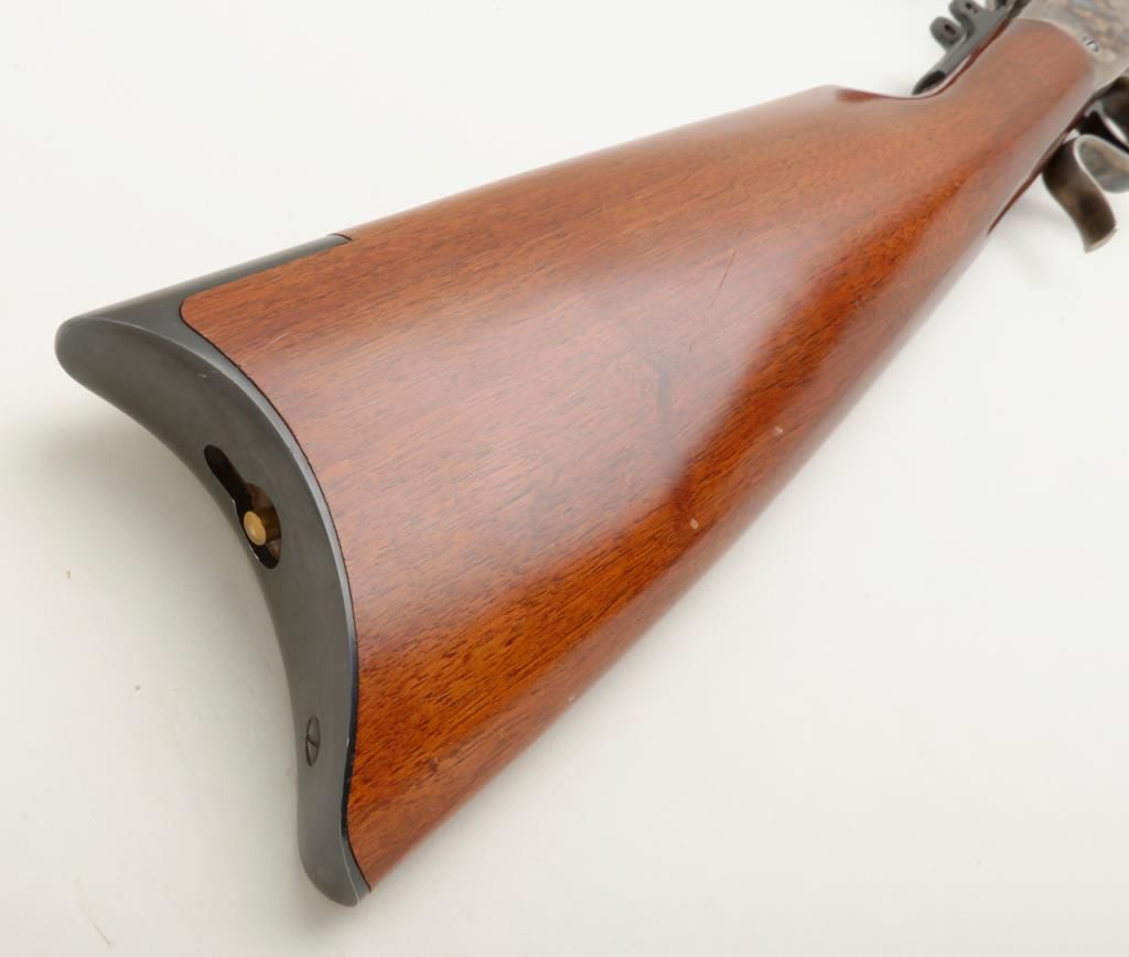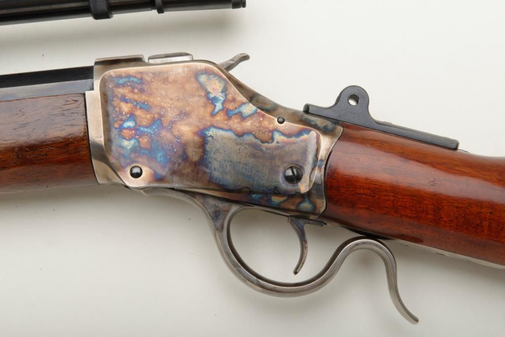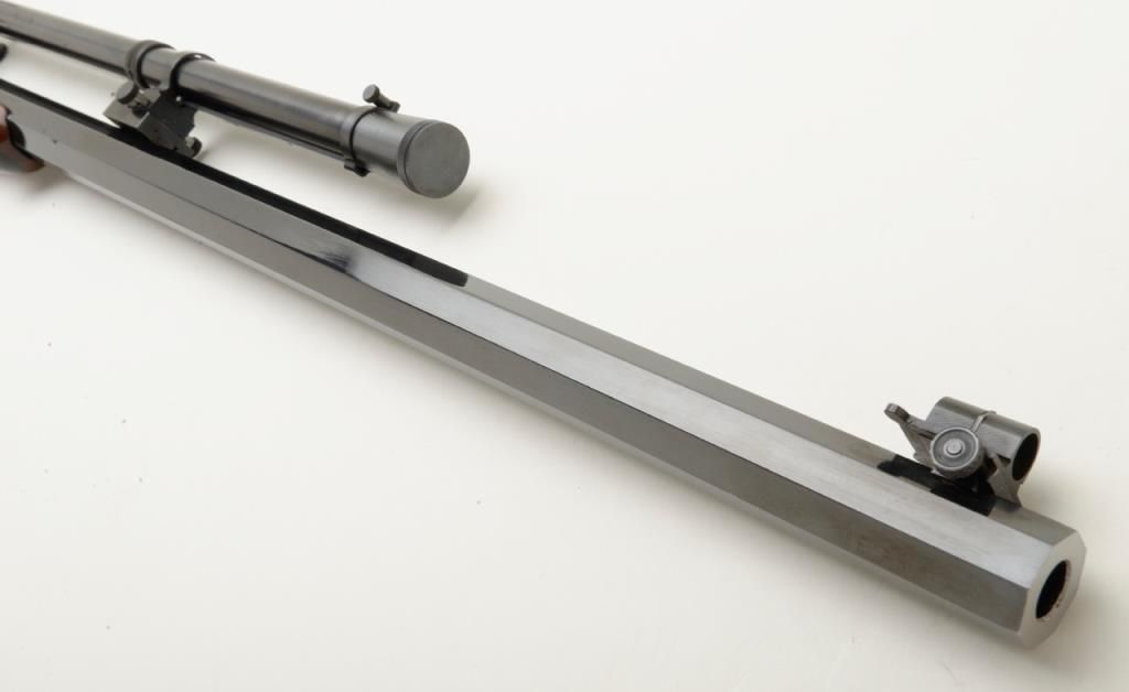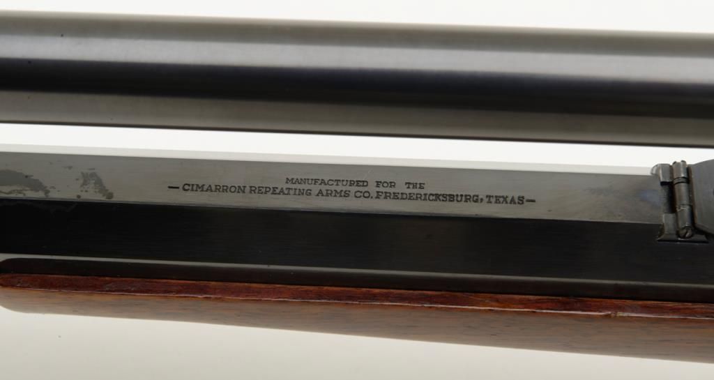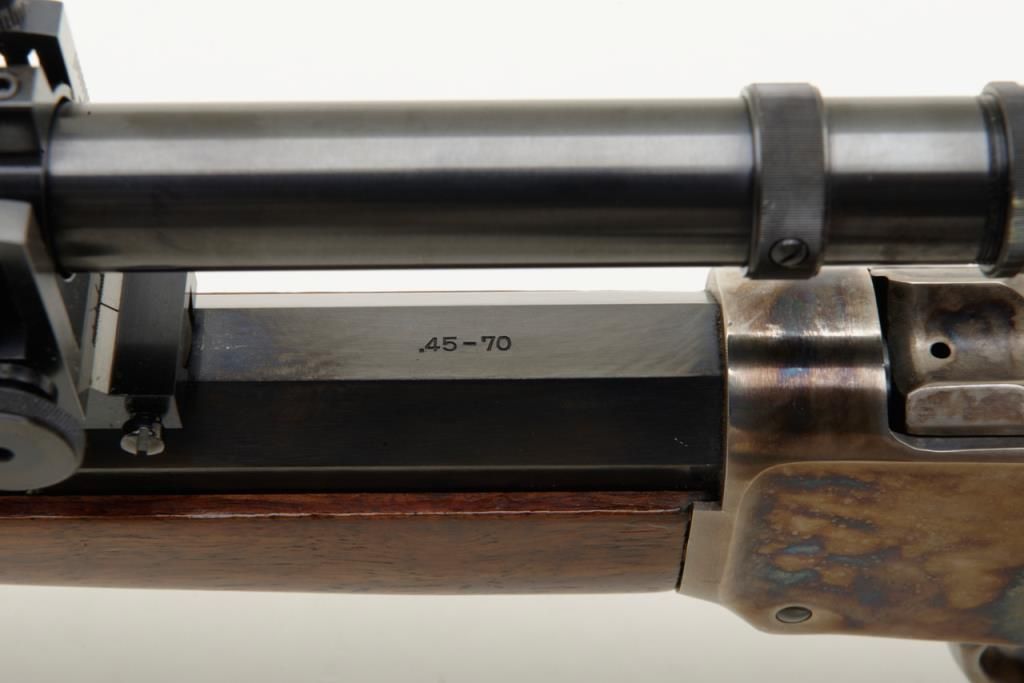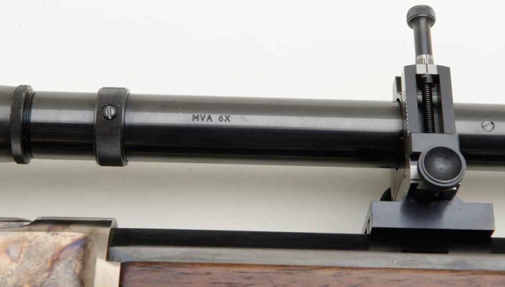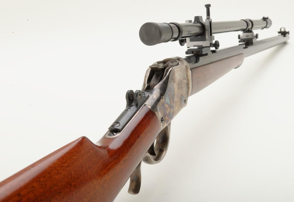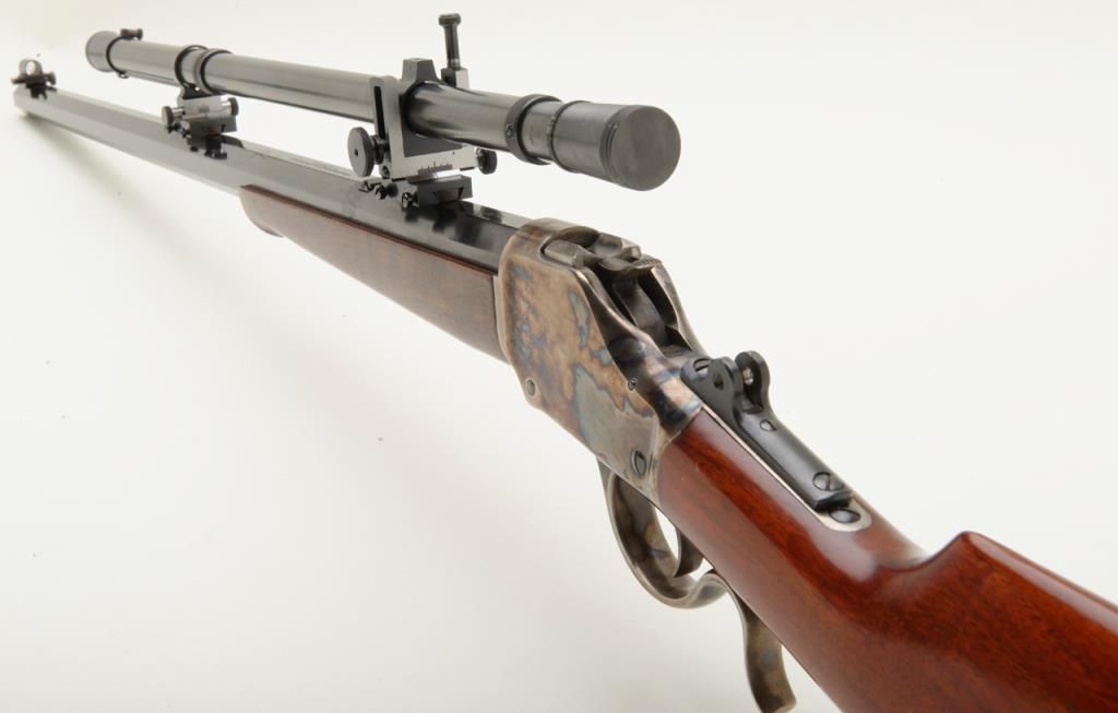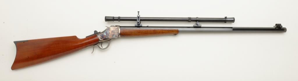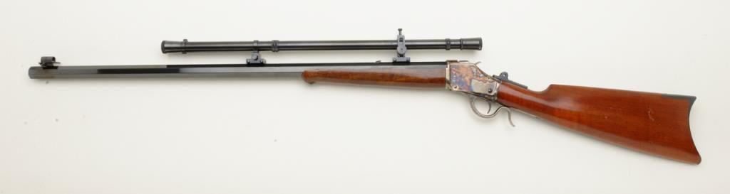 Cimarron reproduction of a Model 1885 High Wall single shot rifle, .45-70 cal., 30” octagon barrel, blue and casehardened finish, wood stocks, #478; mounted with an “MVA” 6X scope displaying good optics. This gun is in overall fine condition showing the majority of its original finish, fine bore, action, markings and wood stocks. (Modern/PPT). Est.: $400-$800.