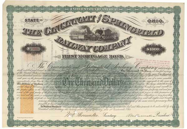 1874, Ohio. $1000 bond bearing 7% interest. Green/Black with green overprint. Vignette of train at station and stagecoach at top center. Orange imprinted revenue at center. Litho. Couple of small edge chinks at top center. Lightly punch cancelled and Fine.
