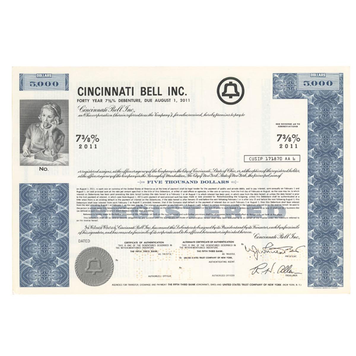 [SPECIMEN]. ----, Ohio. 7 % forty year debenture in Cincinnati Bell Inc. Blue / Black. Vignette of a woman on the phone at upper left. Company seal at upper right and lower left. Perforation cancellation at signatures. Very Fine.