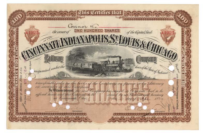1889, Indiana. Stock certificate for 100 shares. Brown with brown overlay. Vignette at top center of steam locomotive. Punch cancelled. Very fine.