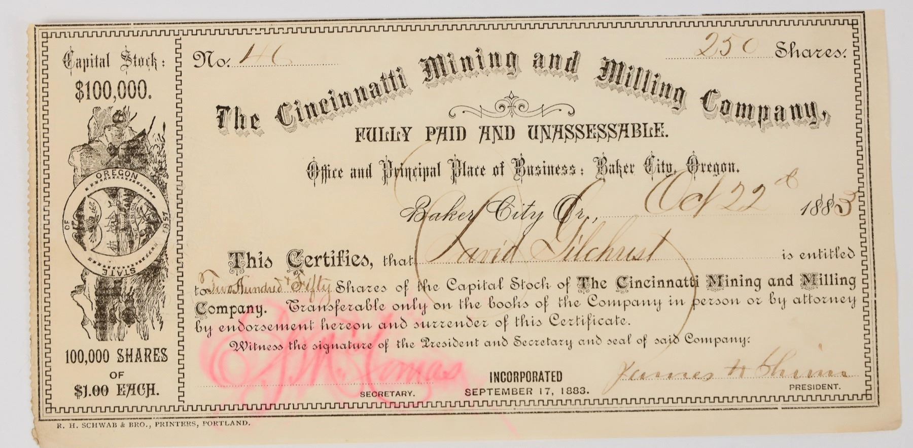 "Office and Principal Place of Business: Baker City, Oregon" printed under title. No. 46, issued for 250 shares in Baker City in 1883. Signed by president James Shinn and the secretary. Not cancelled. According to the 1916 "Mineral Resources of Oregon" by the Oregon Bureau of Mines and Geology, the company was active in the Pedro Mountains of the Rye Valley Mining District.