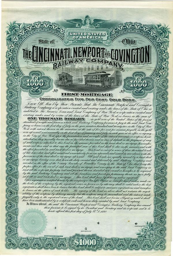 Ohio. $1000 Specimen 5% Consolidated Gold Coupon Bond. Black print with a very ornate green border and under print. Vignette of electric street car at top center of certificate. POC's, XF condition with coupons attached. FBNC. This was the only example of this certificate found in the archives.