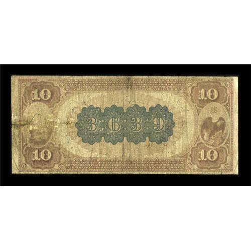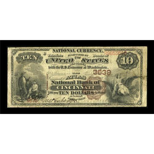 <B>Cincinnati, OH</B></I> - $10 1882 Brown Back Fr. 482 <B>The Atlas NB</B></I> Ch. # 3639<BR> This example is from a tough series for the bank. Of 23 large notes known, only three $10 Brown Backs are recorded. This new addition to the census now becomes the fourth for the denomination. <B>Very Good</B></I>, with a repaired tear at right.<BR><BR><b>Shipping:</b> Coins & Currency (<a target="_blank" href="http://www.heritageauctions.com/common/shipping.php">view shipping information</a>)