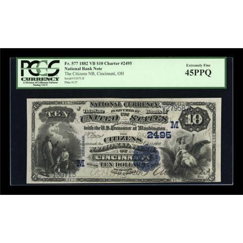 <B>Cincinnati, OH</B></I> - $10 1882 Value Back Fr. 577 <B>The Citizens NB</B></I> Ch. # (M)2495<BR> A deep blue overprint on this Value Back is complemented by the strong officers' signatures. On three sides, the margins are broad and a view of the back reveals embossing of the charter number. <B>PCGS Extremely Fine 45PPQ.</B></I><BR><BR><b>Shipping:</b> Coins & Currency (<a target="_blank" href="http://www.heritageauctions.com/common/shipping.php">view shipping information</a>)