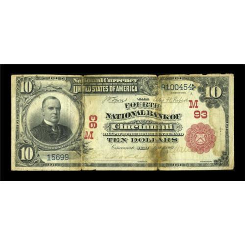 <B>Cincinnati, OH</B></I> - $10 1902 Red Seal Fr. 613 <B>The Fourth NB</B></I> Ch. # (M)93<BR> This piece was carefully put back together as it split on both of the two heavy folds on either side of the center. The overprint remains bold. <B>Very Good, </B></I>repaired<B>.</B></I><BR><BR><b>Shipping:</b> Coins & Currency (<a target="_blank" href="http://www.heritageauctions.com/common/shipping.php">view shipping information</a>)