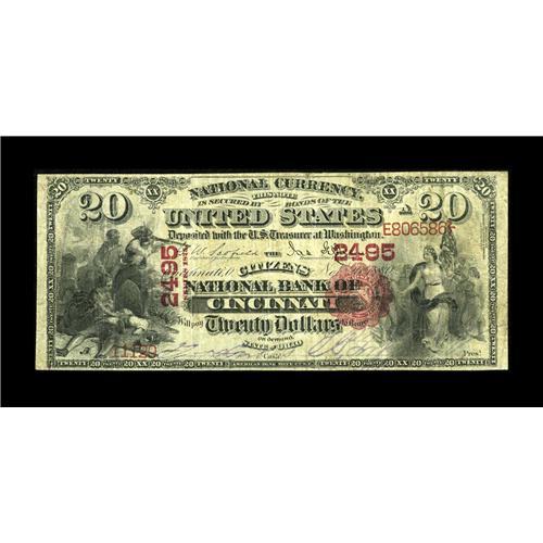 <B>Cincinnati, OH</B></I> - $20 1875 Fr. 434 <B>The Citizens NB</B></I> Ch. # 2495<BR>We sold another example from here in virtually the identical <B>Fine-Very Fine</B></I> grade in our September 2003 auction held in conjunction with the Greater Cincinnati Numismatic Exposition for $1,840, although we'd give a slight edge appearance wise to our offering tonight. Given the substantially stronger market for better Nationals, and especially for types as elusive as the $20 First Charter designs, we anticipate that this nicely margined example will handily surpass the results from three years ago and garner no less than...<BR><I>From The Bill and Kathy Stella Currency Collection</B></I><BR><BR><b>Shipping:</b> Coin/Currency (<a target="_blank" href="http://www.heritageauctions.com/common/shipping.php">view shipping information</a>)