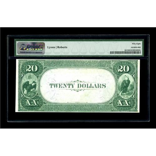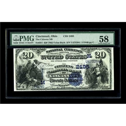 <B>Cincinnati, OH</B></I> - $20 1882 Value Back Fr. 581 <B>The Citizens NB</B></I> Ch. # 2495<BR>The census for $20 Value Backs stands at only about 70 for the entire state. This <B>PMG Choice About Uncirculated 58</B></I> is one of the very nicest and will likely sell at a level higher than the apparently conservative certified grade might imply.<BR><I>From The Bill and Kathy Stella Currency Collection</B></I><BR><BR><b>Shipping:</b> Coin/Currency (<a target="_blank" href="http://www.heritageauctions.com/common/shipping.php">view shipping information</a>)