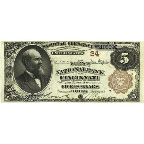 <B>Cincinnati, OH</B></I> - $5 1882 Brown Back Fr. 466 <B>The First NB</B></I> Ch. # 24<BR>A lovely low charter Brown Back which is certain to please. Well margined <B>Extremely Fine-About Uncirculated,</B></I> with great eye appeal, a premium example in all respects.