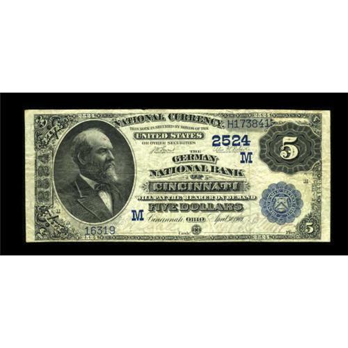 <B>Cincinnati, OH</B></I> - $5 1882 Date Back Fr. 537 <B>The German NB</B></I> Ch. # (M)2524<BR> Anti-German sentiment during and after WWI would cause this bank to change its name. This ethnic title example features lightly faded purple stamped signatures. <B>Very Fine.</B></I><BR><BR><b>Shipping:</b> Coins & Currency (<a target="_blank" href="http://www.heritageauctions.com/common/shipping.php">view shipping information</a>)