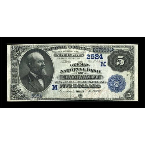 <B>Cincinnati, OH</B></I> - $5 1882 Date Back Fr. 537 <B>The German NB</B></I> Ch. # (M)2524<BR> Anti-German sentiment during World War I would cause this bank to change its name. This ethnic title example features slightly faded stamped signatures. <B>Very Fine</B></I>.<BR><BR><b>Shipping:</b> Coins & Currency (<a target="_blank" href="http://www.heritageauctions.com/common/shipping.php">view shipping information</a>)