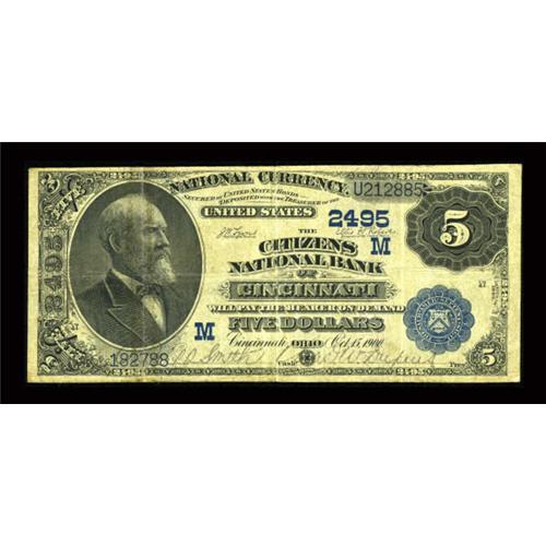 <B>Cincinnati, OH</B></I> - $5 1882 Value Back Fr. 574 <B>The Citizens NB</B></I> Ch. # (M)2495<BR> The overprint is bold as are the signatures. <B>Fine.</B></I><BR><BR><b>Shipping:</b> Coins & Currency (<a target="_blank" href="http://www.heritageauctions.com/common/shipping.php">view shipping information</a>)