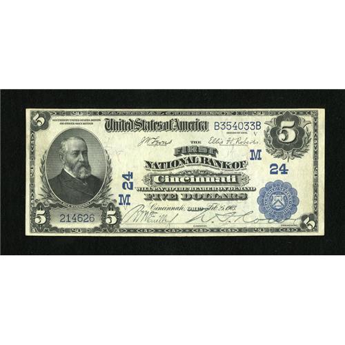 <B>Cincinnati, OH</B></I> - $5 1902 Date Back Fr. 590 <B>The First NB</B></I> Ch. # (M)24<BR>An attractive issue with bold stamped signatures. <B>Extremely Fine.</B></I><BR><I>From The Collection of Greg Southward</B></I><BR><BR><b>Shipping:</b> Coins & Currency (<a target="_blank" href="http://www.heritageauctions.com/common/shipping.php">view shipping information</a>)