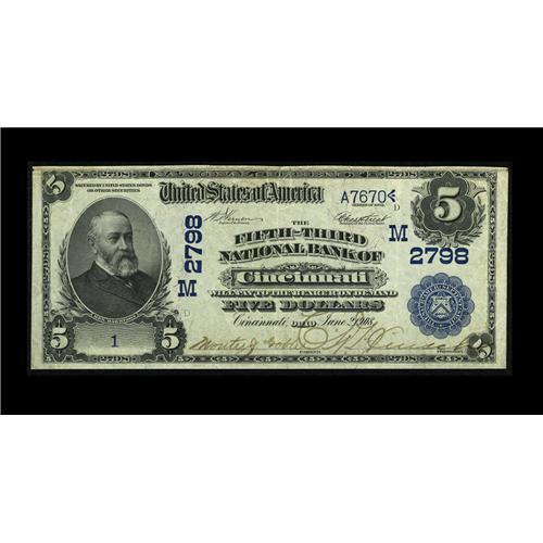 <B>Cincinnati, OH</B></I> - $5 1902 Date Back Fr. 592 <B>The Fifth-Third NB</B></I> Ch. # (M)2798<BR>This is an attractive serial number 1 Date Back which is the only serial number 1 example recorded in the census for this charter number as the other number 1 note with partial information in the Kelly census is probably a duplicate entry. This note has an illustrious pedigree dating back to its 1966 sale by William Philpott, Jr., whose letter of transmittal is enclosed with this lot. Pen signed <B>Extremely Fine,</B></I> save for a couple of pinholes and certain to see some spirited bidding likely ending in the range of...<BR><BR><b>Shipping:</b> Coin/Currency (<a target="_blank" href="http://www.heritageauctions.com/common/shipping.php">view shipping information</a>)