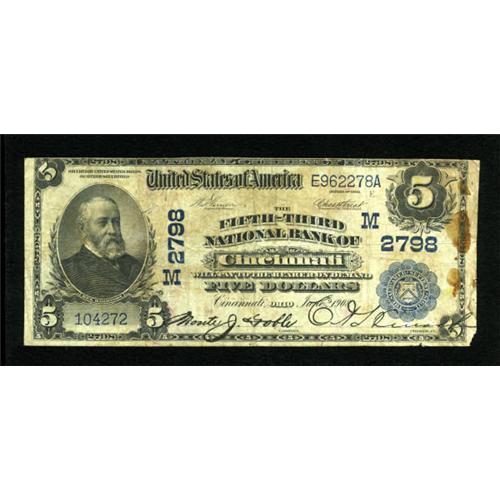 <B>Cincinnati, OH</B></I> - $5 1902 Date Back Fr. 592 <B>The Fifth-Third NB</B></I> Ch. # (M)2798<BR> The third title is noted on this issue that has some rust stains and breaks in the margins. <B>Fine.</B></I><BR><BR><b>Shipping:</b> Coins & Currency (<a target="_blank" href="http://www.heritageauctions.com/common/shipping.php">view shipping information</a>)