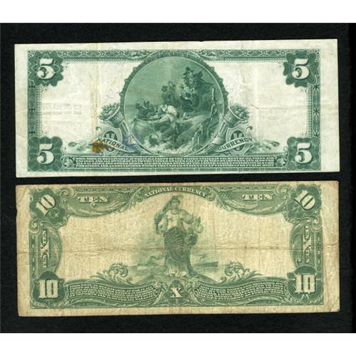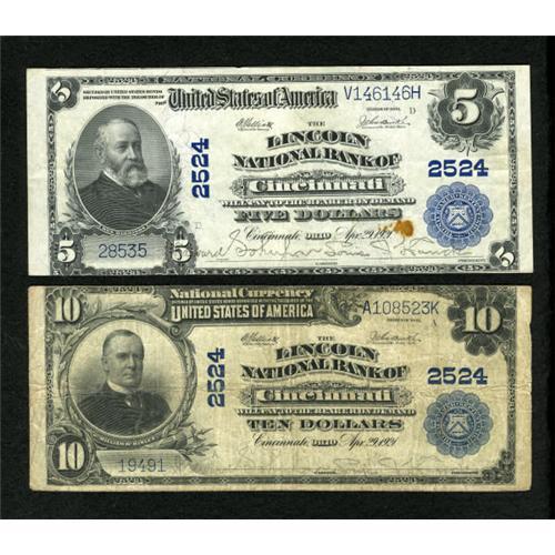 <B>Cincinnati, OH</B></I> - <B>A Circulated Pair</B></I><BR> $5 1902 Plain Back Fr. 607 <B>The Lincoln NB</B></I> Ch. # 2524, <B>Very Fine </B></I>with a rust spot and a $10 1902 Plain Back Fr. 633 <B>The Lincoln NB</B></I> Ch. # 2524, <B>Fine</B></I>.<BR><BR><b>Shipping:</b> Coins & Currency (<a target="_blank" href="http://www.heritageauctions.com/common/shipping.php">view shipping information</a>)