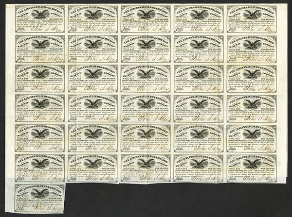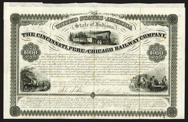 Indiana. $1000 I/U 7% Coupon Bond. Black print with an ornate border. Vignette of a locomotive at top of certificate. Men smelting metal on right and a farm scene at left. XF condition with 31 coupons remaining. Danforth, Wright, and Co. Printers.
