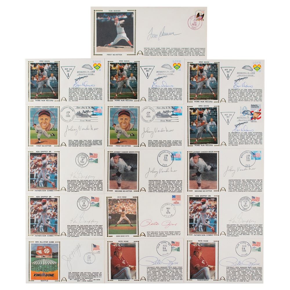 Sixteen Gateway covers with silk color cachets, each signed in ink by a Cincinnati Reds great. Includes: Tom Seaver, Joe Morgan, Pete Rose (3), Ken Griffey, Sr. (3), Johnny Vander Meer (4), and Eric Davis (4). In overall fine condition.