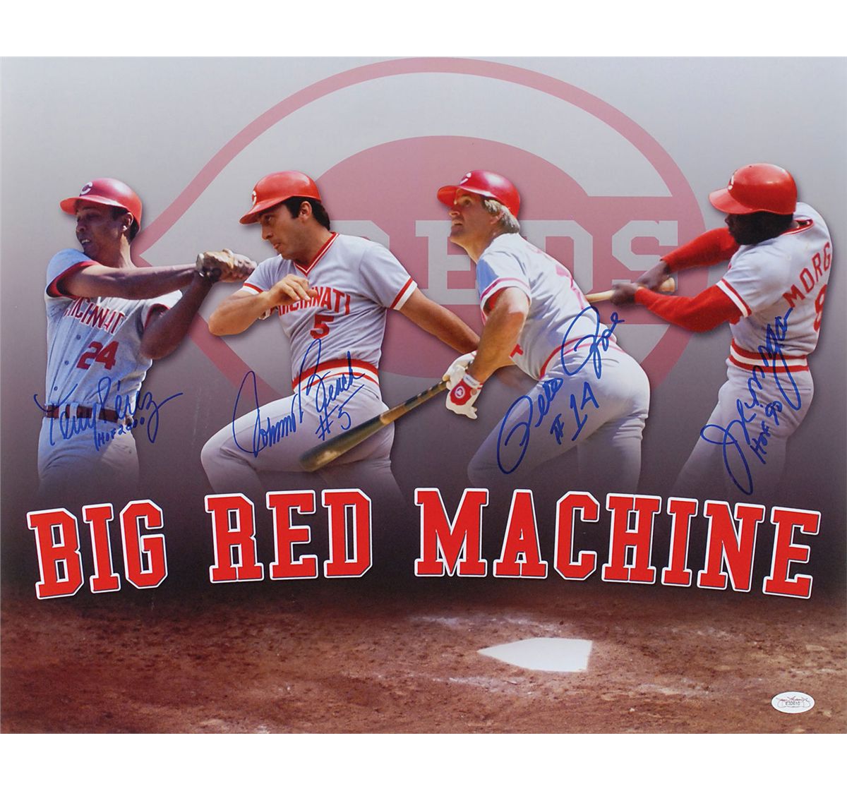 Color satin-finish 20 x 16 composite photo of the heart of the Reds’ lineup, signed in blue felt tip by Tony Perez, Johnny Bench, Pete Rose, and Joe Morgan. In fine condition, with a JSA label affixed to the lower right. Accompanied by a certificate of authenticity from JSA.