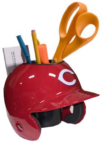 Schutt Sports MLB Licensed Mini Batting Helmet Desk Caddy in the Cincinnati Reds logo. Genuine batter’s helmet scaled down to 1/4 size. Hard durable helmet shell. Perfect for the home or work office, this attention-grabbing desk ornament leaves no doubt to guests and business acquaintances who's your team. Fill it with business cards and team-colored pens, but be prepared to talk Reds baseball when people roll in.