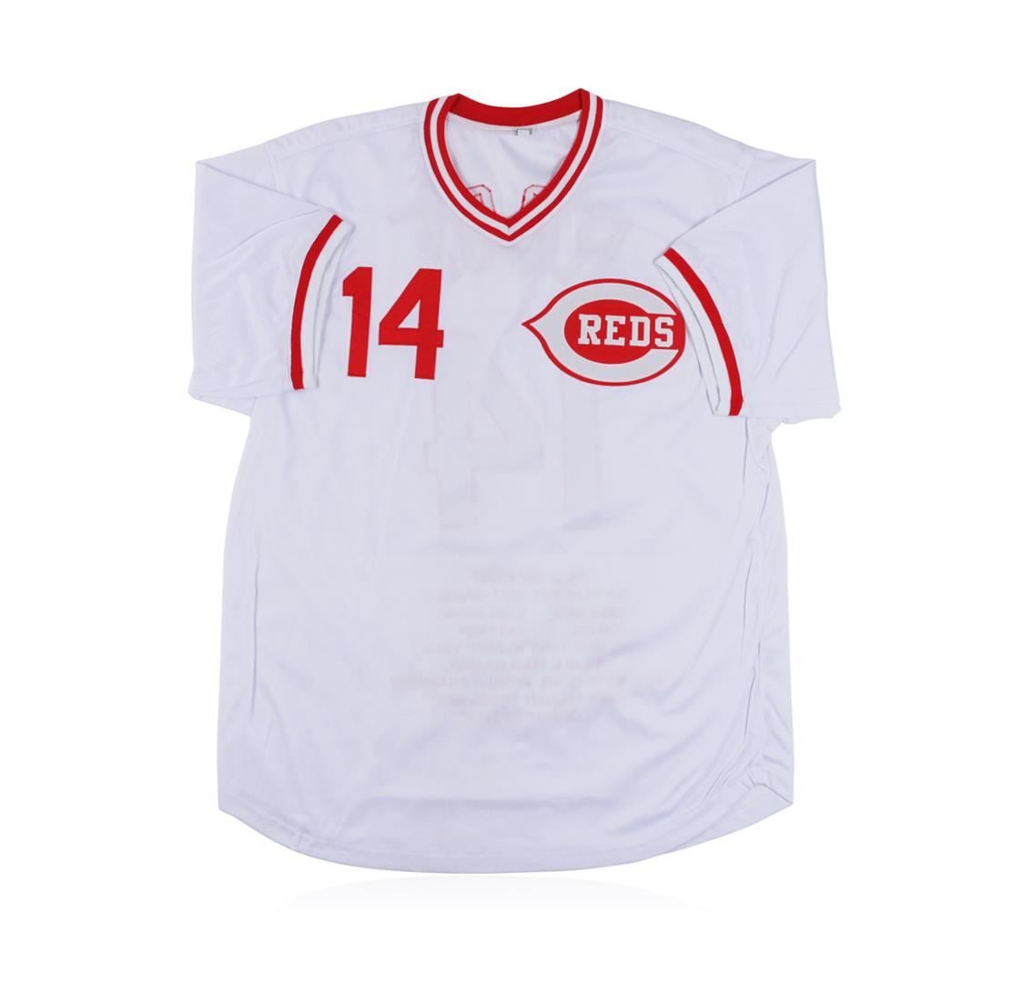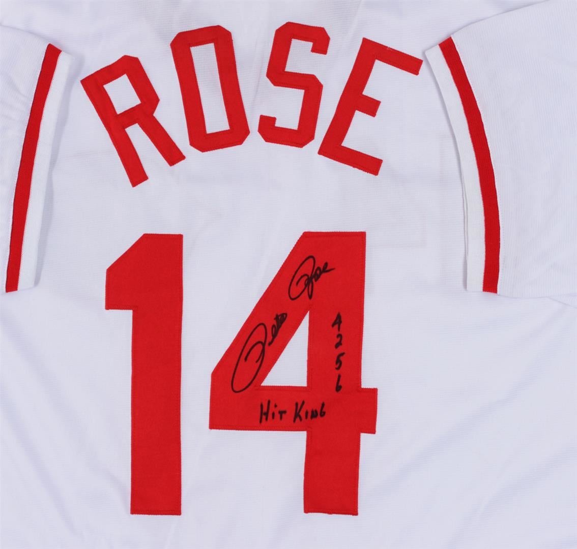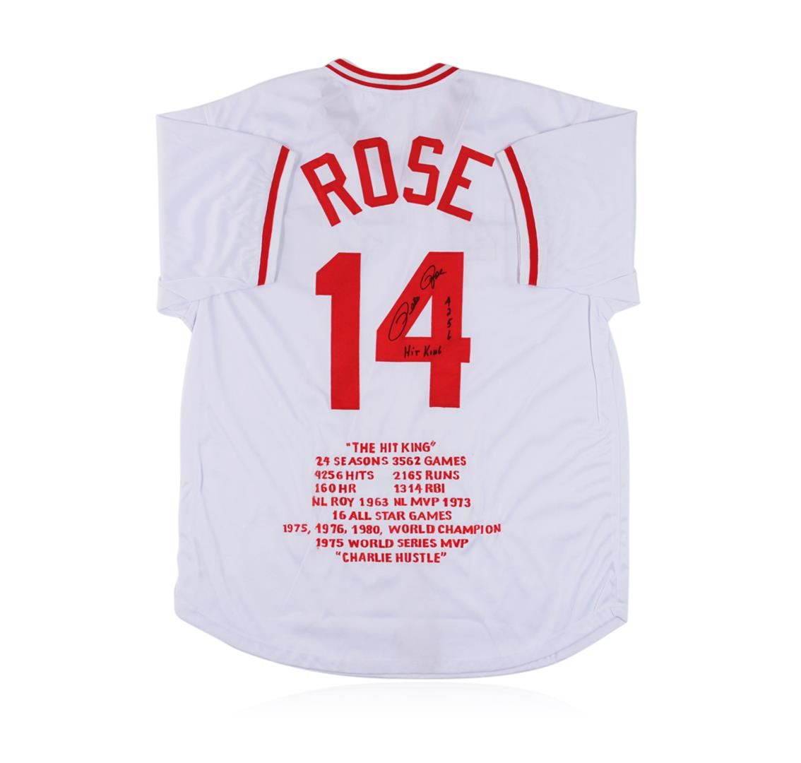 Cincinnati Reds Pete Rose Autographed Jersey With Stats.