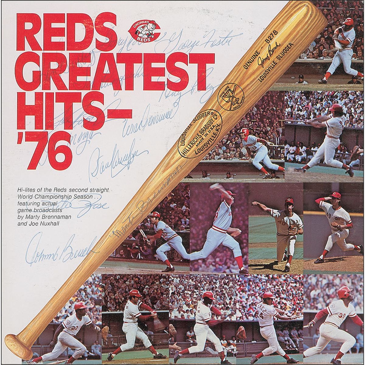 Reds Greatest Hits—’76 album signed on the front cover in blue ballpoint by 12 members of the Reds organization, including Pete Rose, Johnny Bench, Joe Morgan, Tony Perez, George Foster, and Ken Griffey. Partial separation along top edge, light ‘ring of wear’ to cover, and light contrast to a couple of signatures, otherwise fine condition. The record is included.