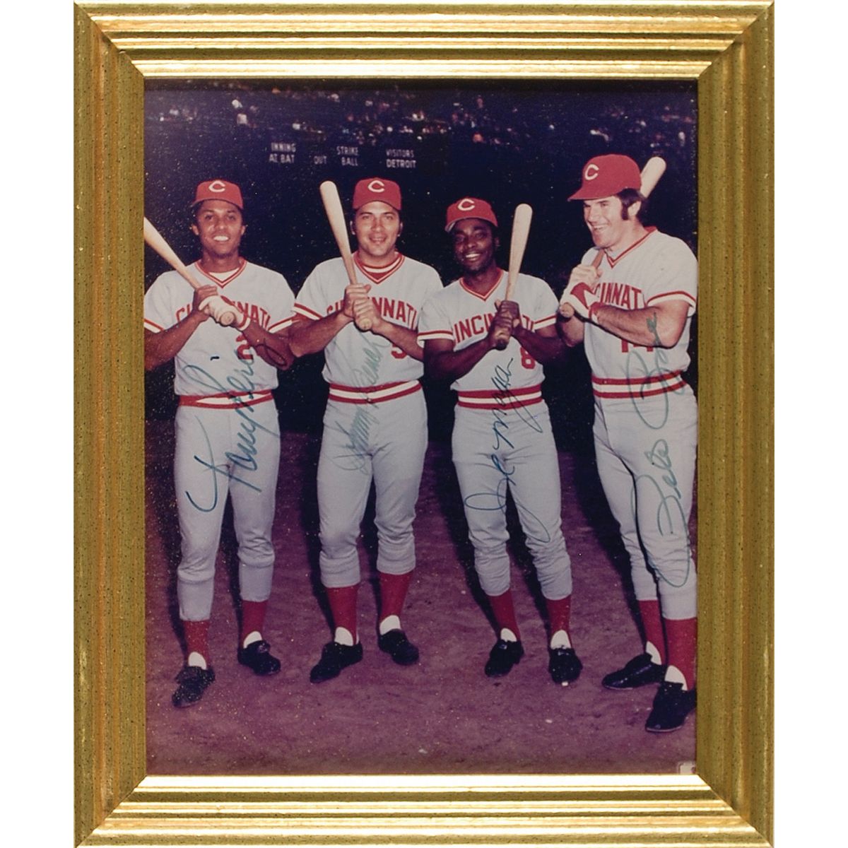 Color glossy 8 x 10 photo of members of the ‘Big Red Machine,’ signed in blue felt tip by Tony Perez, Johnny Bench, Joe Morgan, and Pete Rose. Framed to an overall size of 9.5 x 11.5. In fine condition, with some fading to Bench and Rose signatures.