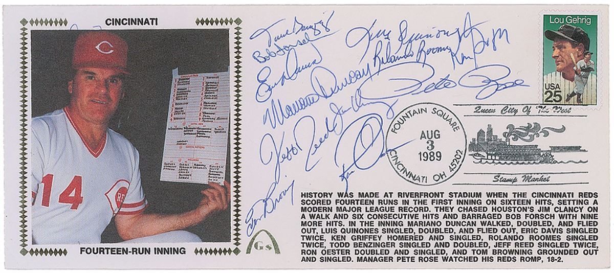 Gateway cover with a silk cachet honoring the Reds’ fourteen-run first inning against the Houston Astros, 9.5 x 4, signed in blue ballpoint by Reds players Mariano Duncan, Luis Quinones, Eric Davis, Ken Griffey, Sr., Rolando Roomes, Todd Benzinger, Jeff Reed, Ron Oester, Tom Browning, and manager Pete Rose, and Houston pitchers Jim Clancy and Bob Forsch. In fine condition. Accompanied by a full letter of authenticity from JSA.