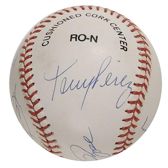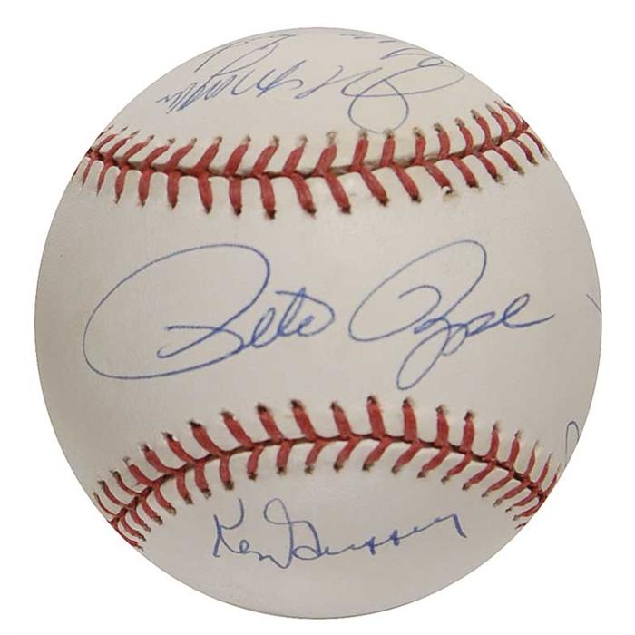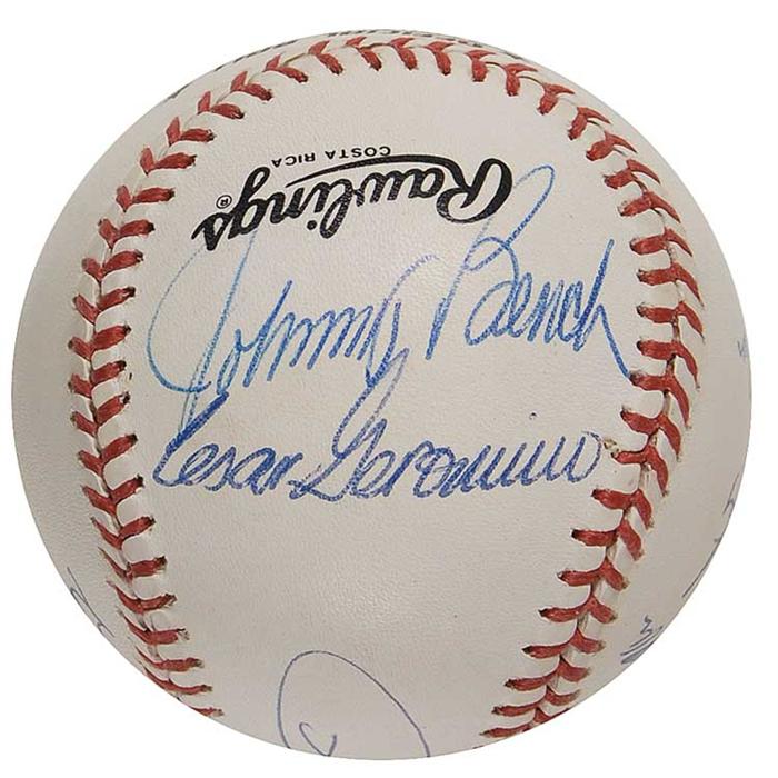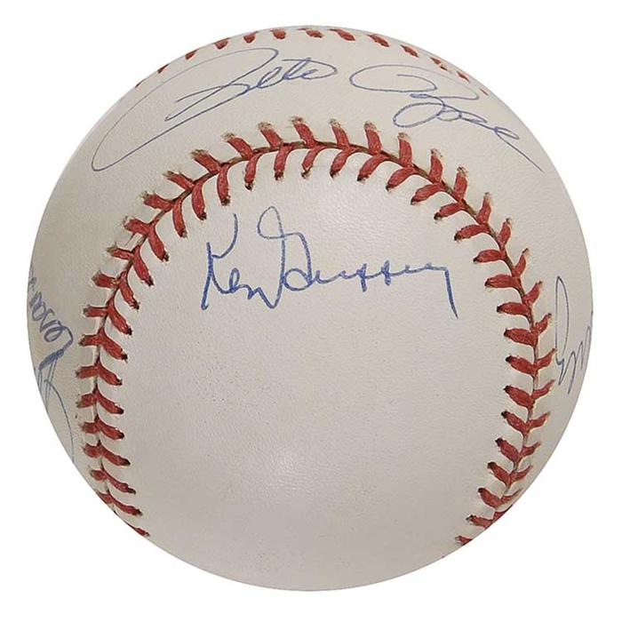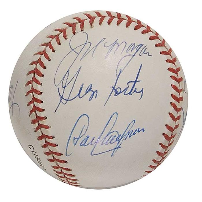 Official Rawlings National League baseball signed in blue ballpoint by all eight members of the starting line-up of the Big Red Machine: Pete Rose (ss), Ken Griffey, Joe Morgan, Tony Perez, George Foster, Johnny Bench, Cesar Geronimo, and Dave Concepcion. In fine condition, with a couple light spot spots of soiling. Pre-certified Steve Grad/PSA/DNA and RRAuction COA.