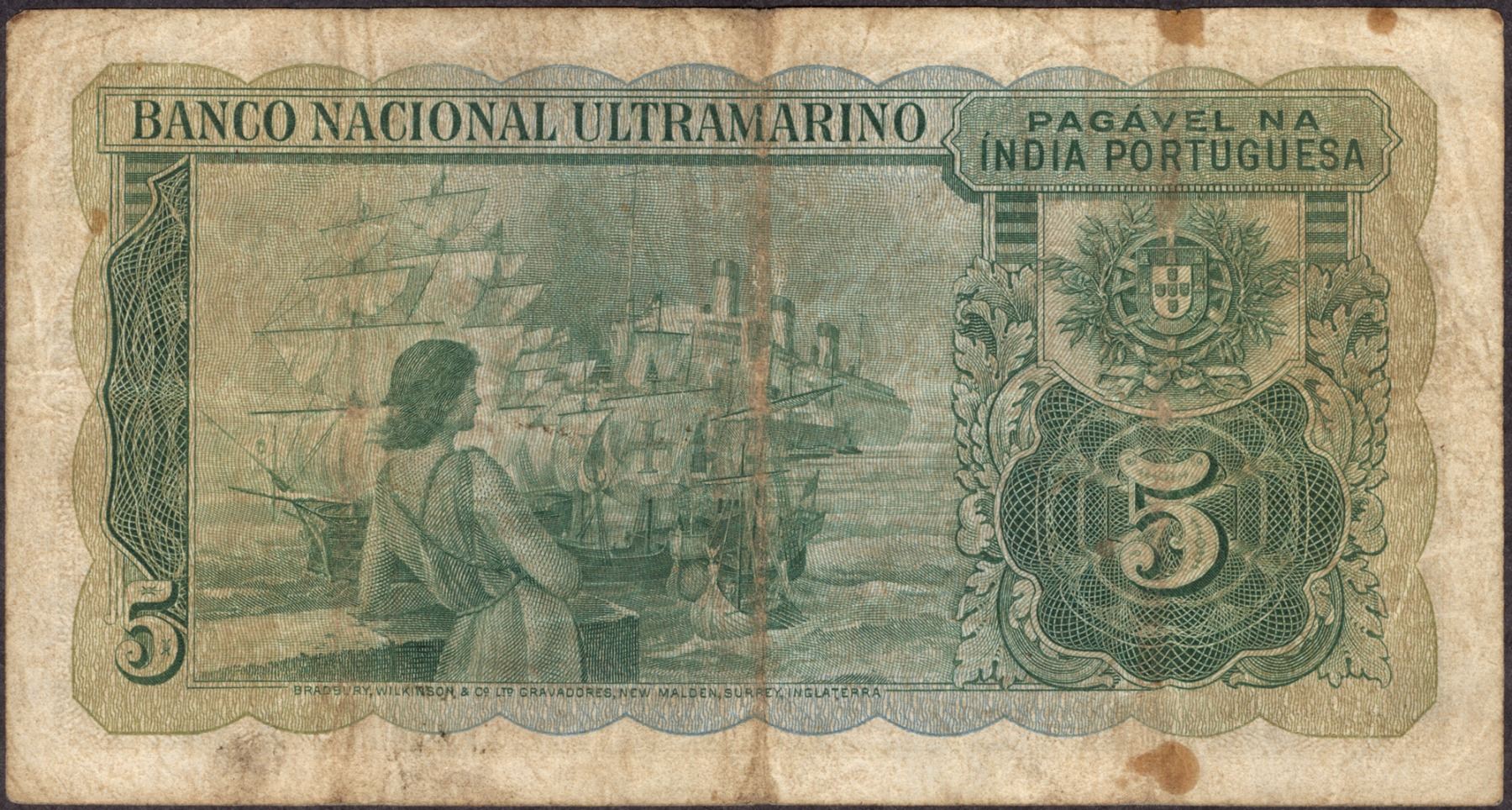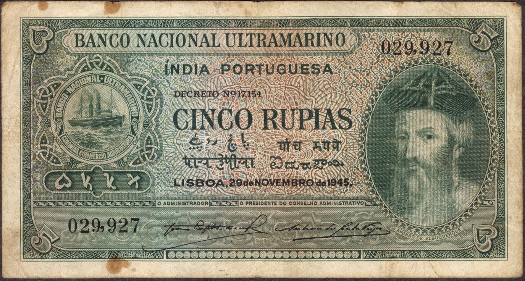 Cinco (Five) Rupias Banknote of Banco Nacional Ultramarino of Portuguese India (Goa) of 1945.