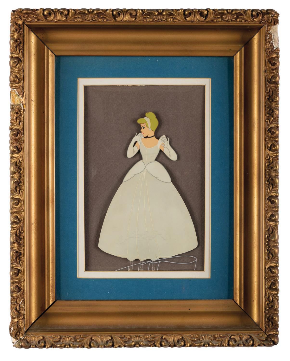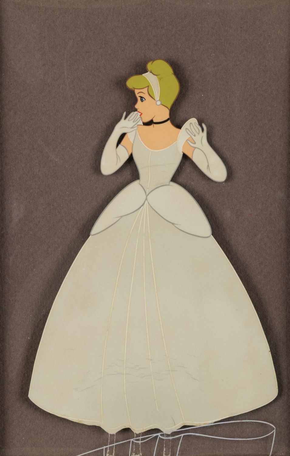 (Disney, 1950) A hand-painted animation cel used in the production of Walt Disney's Cinderella. In 1948, Disney decided to return to feature films, and chose Cinderella as the Studio's next full length animated film. The cel depicts Cinderella in her beautiful new dress for the royal ball. The reveal of Cinderella's stunning dress is one of the most memorable moments of this Disney Classic, with few cels depicting her in her gown. The piece has a 9.5"x6.25" mat opening within its 16.75"x13.25" wooden frame. The painted character image size is 9.5"x6.25". It displays in very good condition, exhibiting minimal wear and the slightest buckling to the cel.