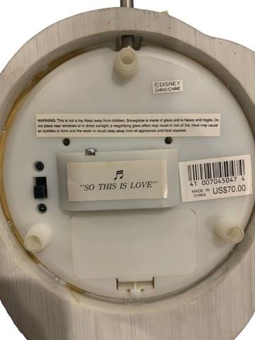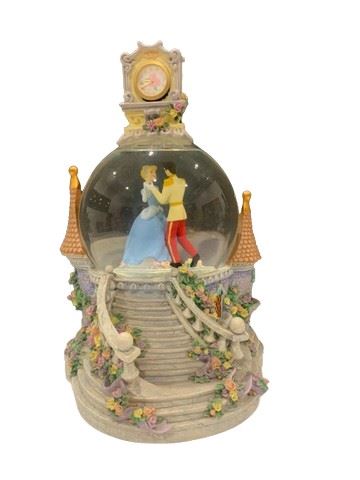 Disney’s Cinderella musical snow globe, in perfect conditon. It plays the song: "So This Is Love". Porcelain and plastic globe. Fragile. Must be professionally packed by a third-party shipping company. (11”x6”)