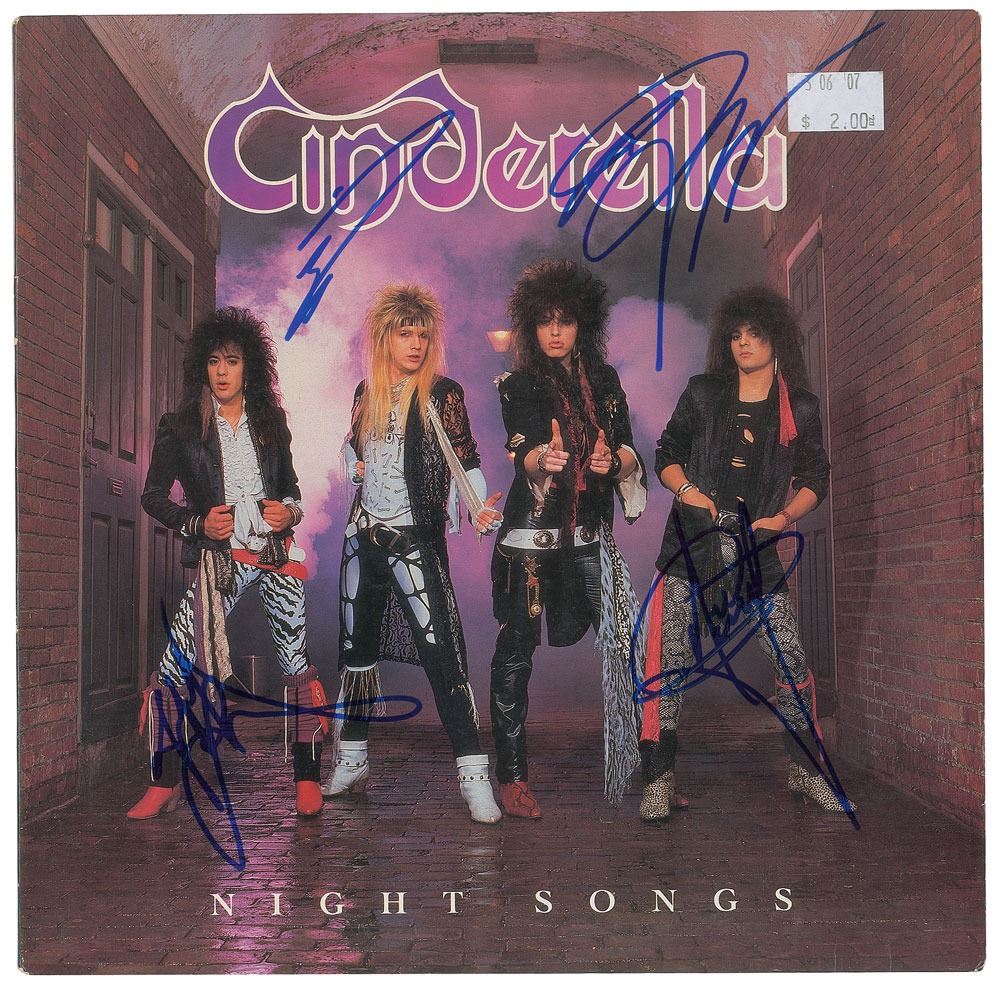 Night Songs album by Cinderella, signed on the front cover in blue felt tip by Tom Keifer, Jeff LaBar, Fred Coury, and Eric Brittingham. In fine condition, with an affixed price sticker. The record is included. Accompanied by a John Brennan Collection letter of provenance.