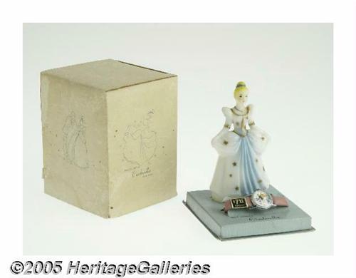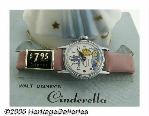 <B>Cinderella Watch with Display Box (U. S. Time Corp., 1960s).</B></I> The most successful novelty watches were produced by U.S. Time (Timex), who collaborated and manufactured copyrighted watches for Walt Disney Productions. They reached their pinnacle in the 1950s and 1960s, producing a myriad of Disney character watches. This alluring Cinderella wrist watch comes complete with the original box, display stand and plastic Cinderella figurine. The dial features Cinderella with a castle behind her. The pink vinyl strip is here with the original price tag attached. The box has a bit of water staining on the cover and along the bottom edge of two sides, but the interior is clean with almost no wear. The plastic Cinderella is in Excellent condition. The watch is in never worn, Mint Condition. <I>From the Larry Jacobs Collection.</B></I>