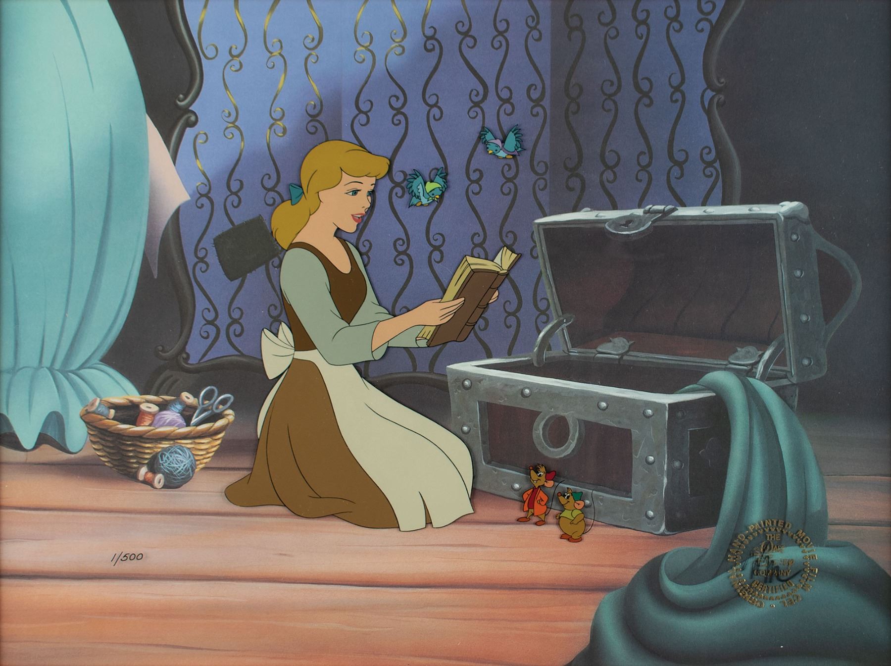 (Walt Disney Studios, 1987) Original limited edition hand-painted cel entitled 'Preparing for the Ball,' numbered 1/500, showing Cinderella working as a scullery maid with her two mouse friends. The cel is placed on its matching Disney litho background. Image measures 4.75 x 6.75 , with a mat opening of 15.5 x 11.5. Framed to an overall size of 24.75 x 20.75. The piece has the silver Walt Disney Company seal to lower right. In fine condition. Accompanied by a certificate of authenticity from The Walt Disney Company.
