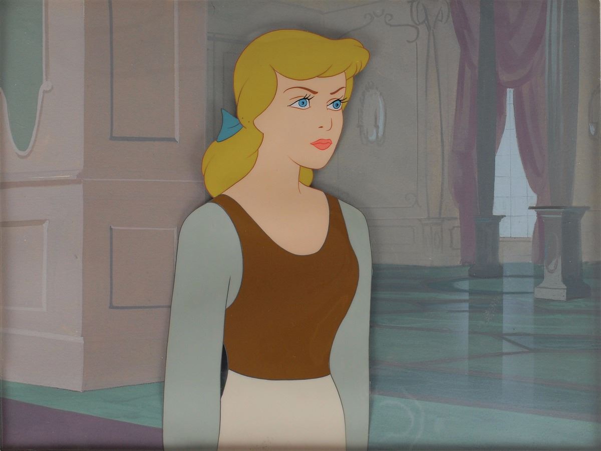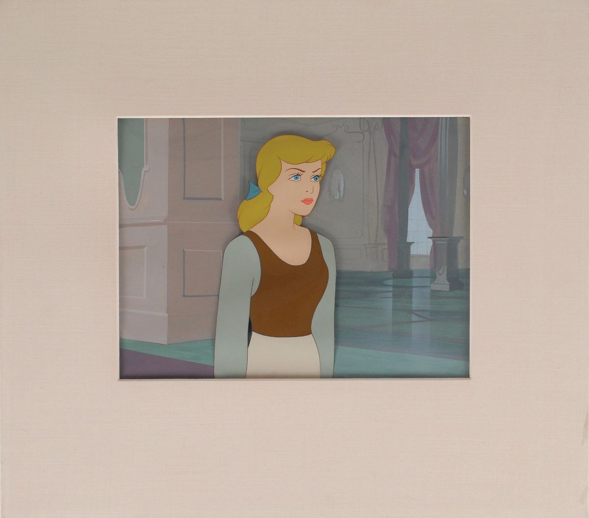 (Walt Disney Studios, 1950) Original production cel and production background featuring Cinderella from Cinderella, showing her in her day-to-day clothes. The cel is placed on a hand-painted production background. Image measures 3.25 x 6.5, with a mat opening of 9.5 x 7. Mat dimensions are 15.75 x 14. In fine condition.