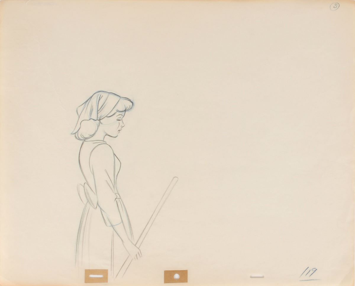 (Walt Disney Studios, 1950) Original production drawing from Cinderella depicting the title character in a three-quarter length profile pose, showing a forlorn Cinderella in her scullery maid outfit and holding a broom. Accomplished in graphite and colored pencil on untrimmed 15.5 x 12.5 animation paper. Image measures 4.5 x 8.5. In fine condition.