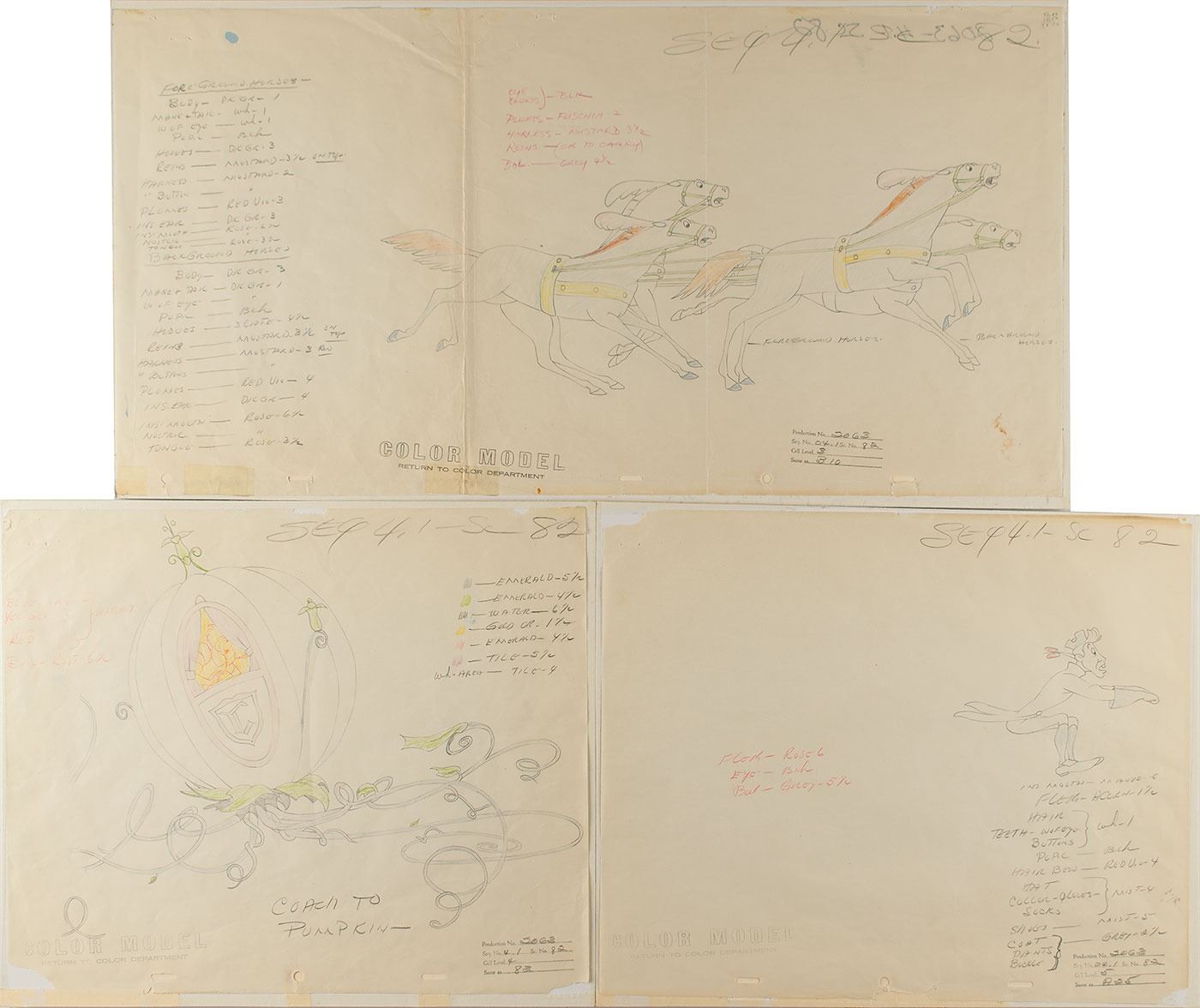 (Walt Disney Studios, 1950) Superb grouping of three original production color model drawings featuring Cinderella's Pumpkin Coach from Cinderella. Accomplished in graphite and colored pencil on animation paper ranging in size from 15 x 12.5 to 24.25 x 12.5, all stamped "Color Model, Return to Color Department" at the bottom. Drawings include the "Coach to Pumpkin" transformation with Cinderella seen inside (image size of 13 x 10), the coachman riding in front (image size of 5.25 x 3.75), and the horses pulling the carriage (image size of 16.5 x 6). All are marked in the lower corners, "Production No. 2063, Seq. No. 04.1, Sc. No. 82," and are heavily annotated with color information. In overall fine condition, with a few small edge tears and losses. These are notably large and scarce drawings desirably featuring the entire carriage.