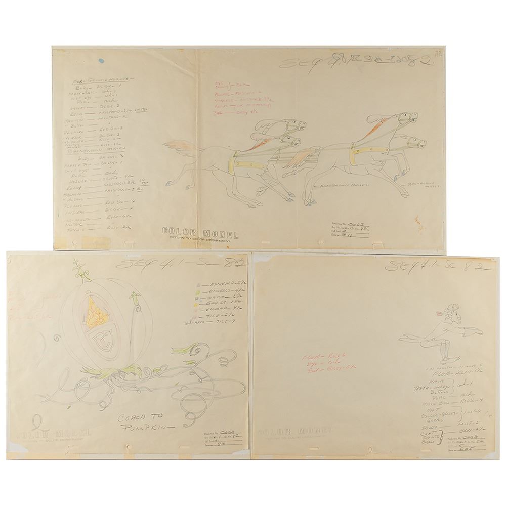 (Walt Disney Studios, 1950) Superb grouping of three original production color model drawings featuring Cinderella's Pumpkin Coach from Cinderella. Accomplished in graphite and colored pencil on animation paper ranging in size from 15 x 12.5 to 24.25 x 12.5, all stamped "Color Model, Return to Color Department" at the bottom. Drawings include the "Coach to Pumpkin" transformation with Cinderella seen inside (image size of 13 x 10), the coachman riding in front (image size of 5.25 x 3.75), and the horses pulling the carriage (image size of 16.5 x 6). All are marked in the lower corners, "Production No. 2063, Seq. No. 04.1, Sc. No. 82," and are heavily annotated with color information. In overall fine condition, with a few small edge tears and losses. These are notably large and scarce drawings desirably featuring the entire carriage.