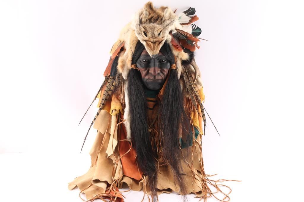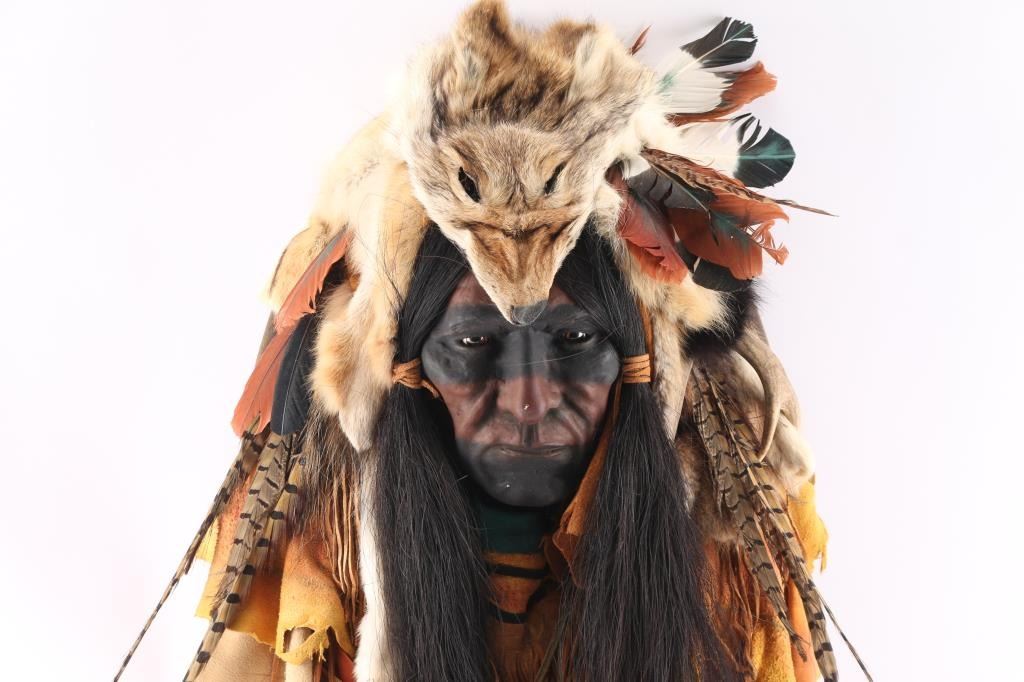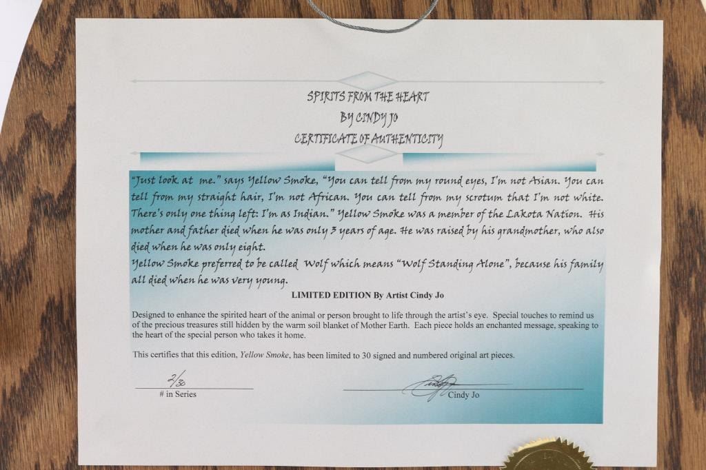 From Spirits From The Heart. Artist's statements: For more than thirty years, I have immersed myself in the study and creation of Native American art. I love the narrative beauty of Native American culture, and have a desire to honor my Cherokee heritage. It has driven me to understand and represent the character, strength, and honor of Native American people. I am a self-taught artist, competent in ceramic, clay, bronze, and other mixed media, and I am meticulous in researching and understanding the subject matter I represent with each of my pieces. My intent is always to make my art speak to my audience. If eyes convey emotion, posture portrays movement, and detail portrays a story, then I know my pieces are conveying the stories I wish to tell with each one. This is an Indian Mask with coyote headdress entitled Wolf Standing Alone", includes certificate of authenticity number #2/30.