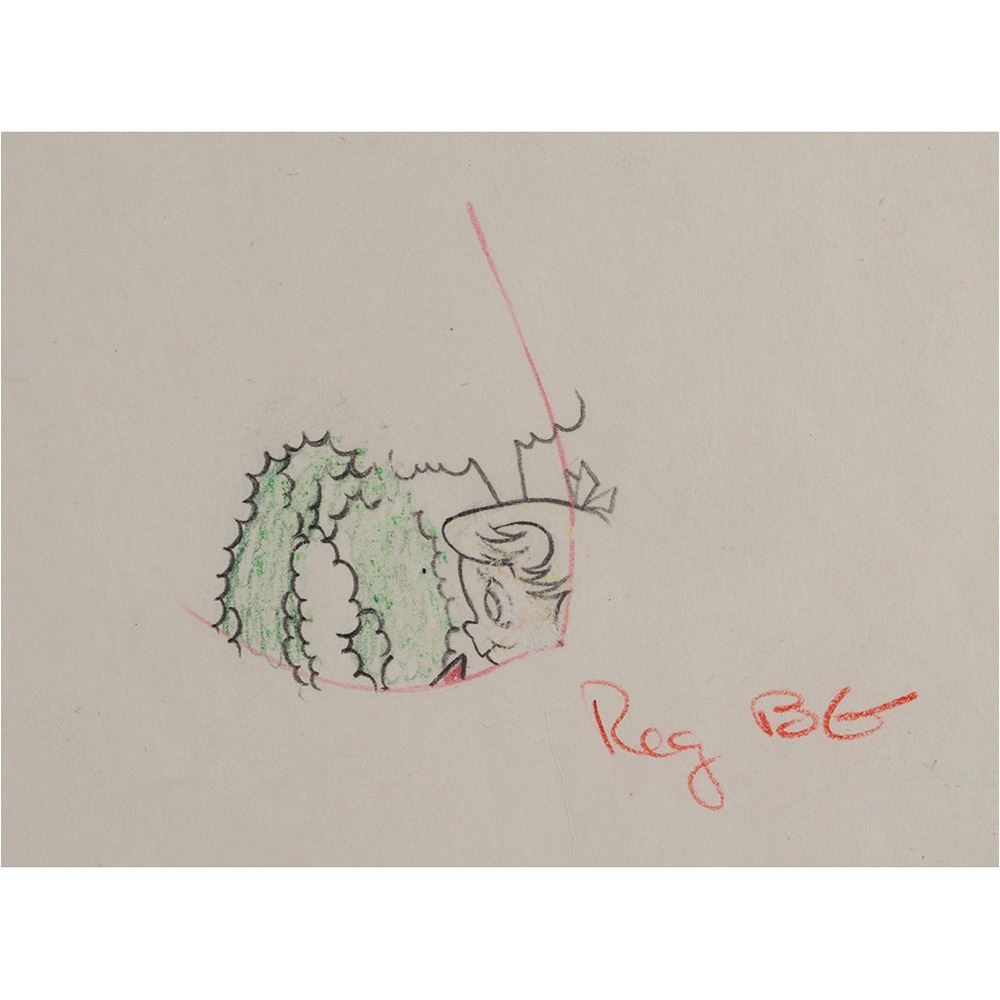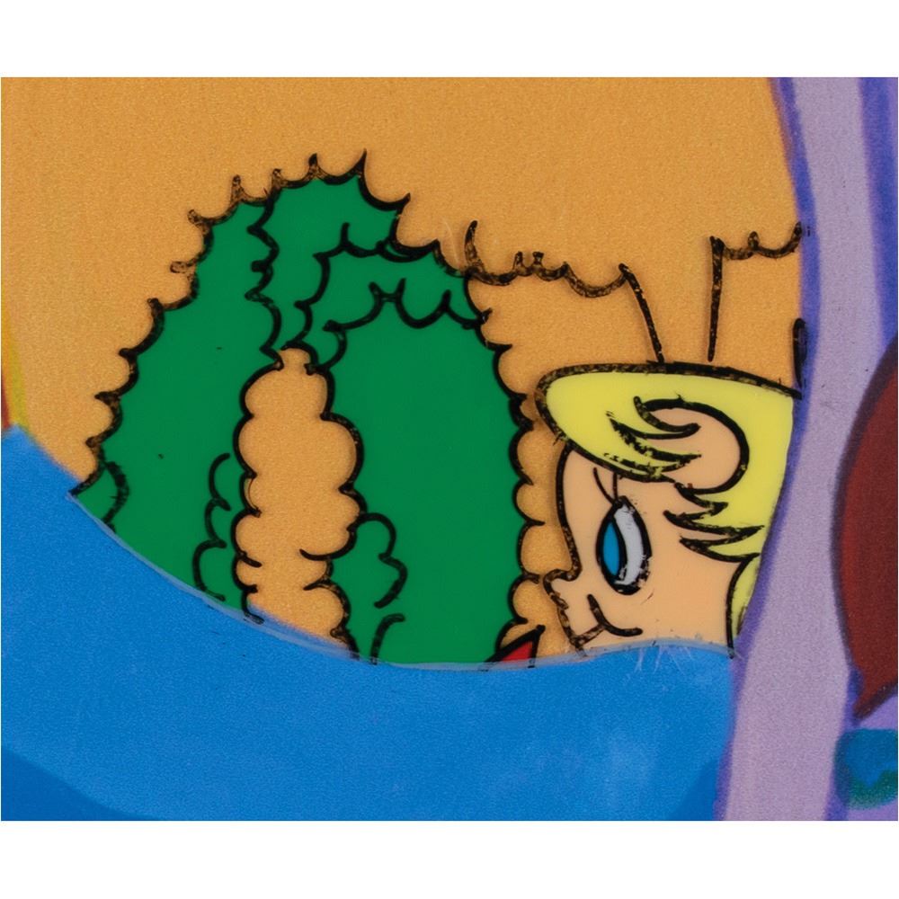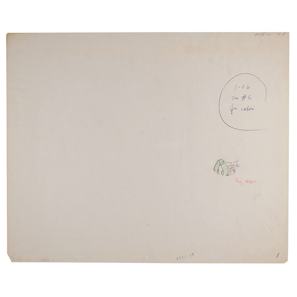 (MGM Studios, 1966) Original production cel and drawing of Cindy-Lou Who from How the Grinch Stole Christmas!, which depicts the pint-sized toddler holding a wreath inside her snow-covered Whoville house. The character image measures 1.5 x 1, and the cel, which is signed in black felt tip by legendary cartoonist Chuck Jones, is placed on a studio copy background measuring 18 x 16. The piece has the gold Linda Jones Enterprises seal to lower left. Included with the cel is the original matching production drawing of Cindy-Lou Who, accomplished in graphite and colored pencil on untrimmed 16.5 x 13.5 animation paper. In overall fine condition. Accompanied by a letter of authenticity from Linda Jones Enterprises.