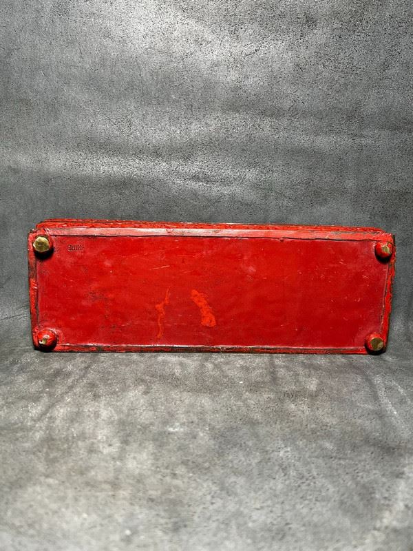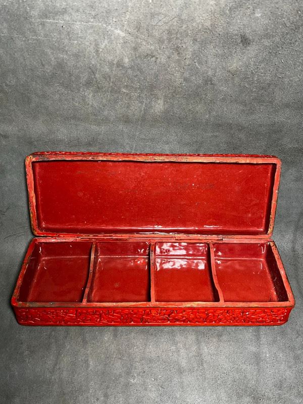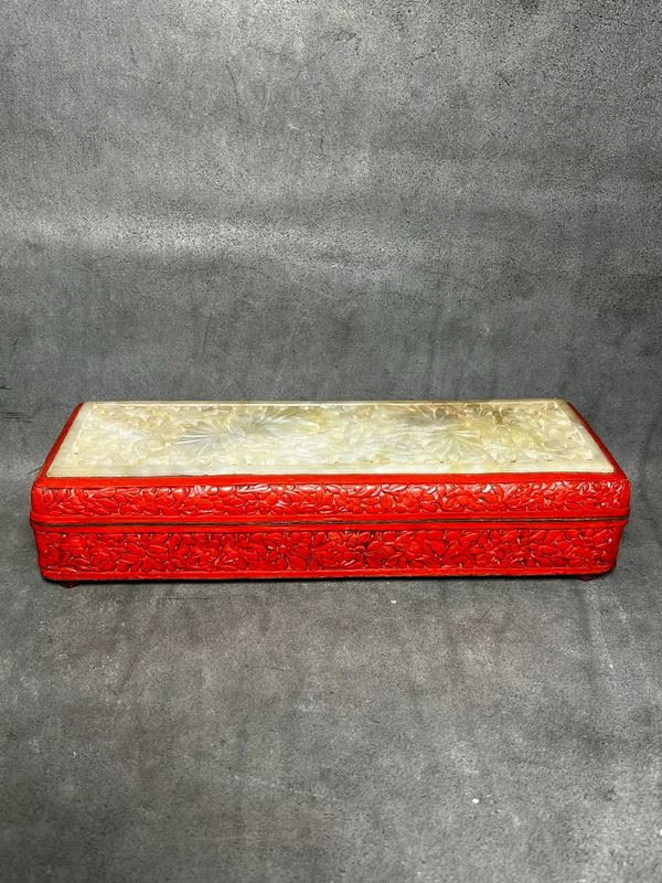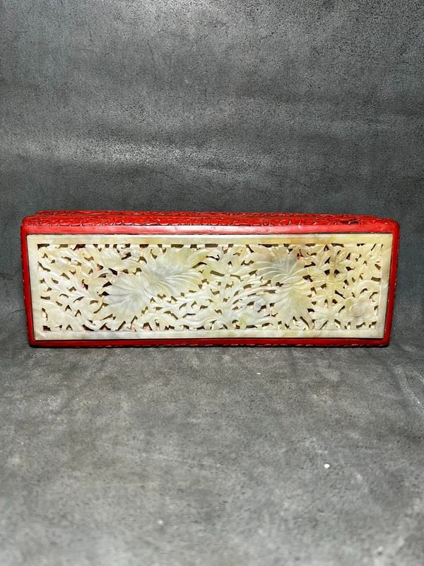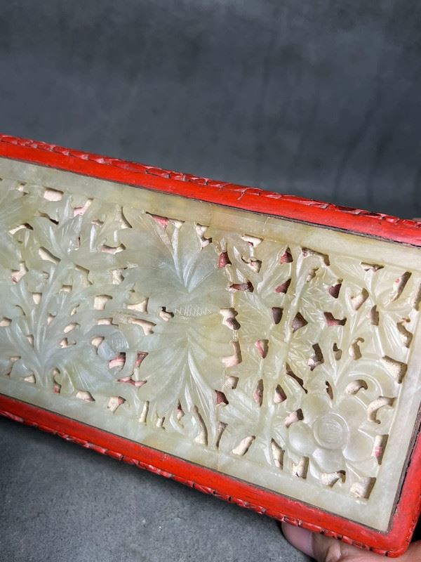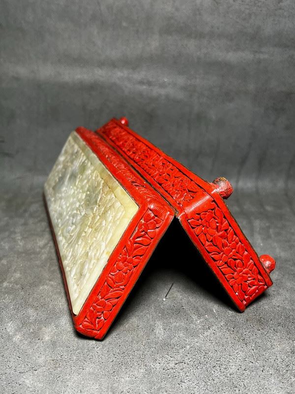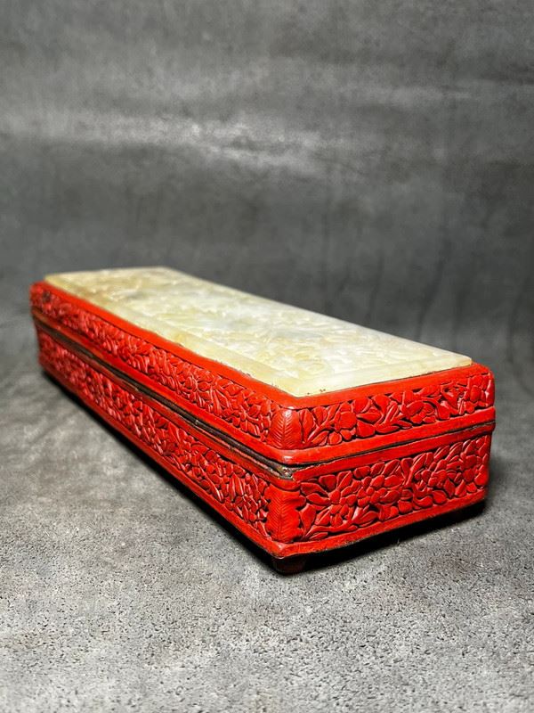 A rectangular copper-bodied box lacquered in cinnabar red, carved in relief with scrolling floral patterns using the tihong (carved lacquer) technique. The lid is inlaid with a finely carved Xiuyan jade plaque featuring floral motifs, its smooth and translucent texture contrasting vividly with the deep red lacquer. Serving both functional and decorative purposes, this box could be used as a sewing container or a jewelry case, exemplifying the craftsmanship and refined taste of the late Qing period.